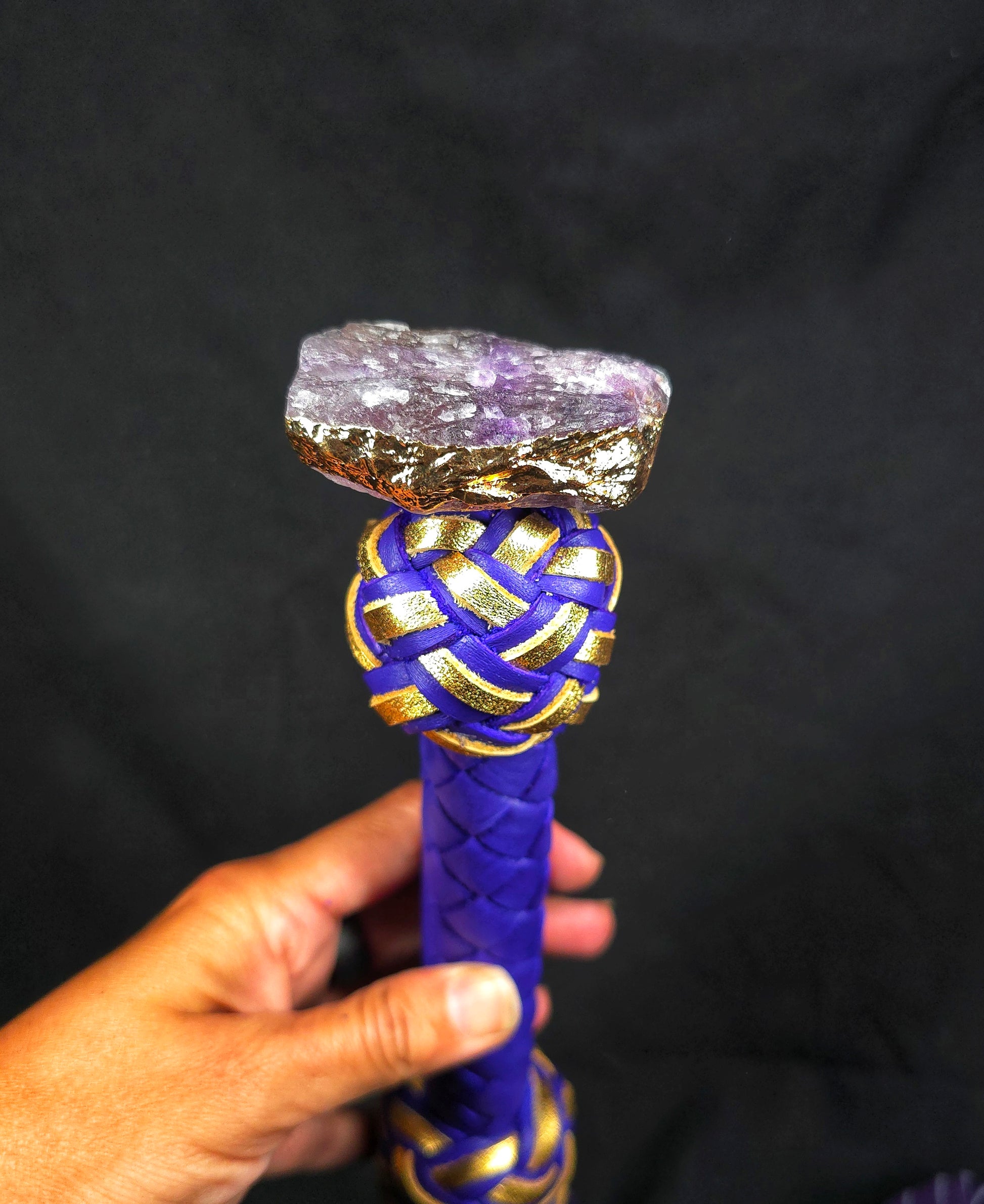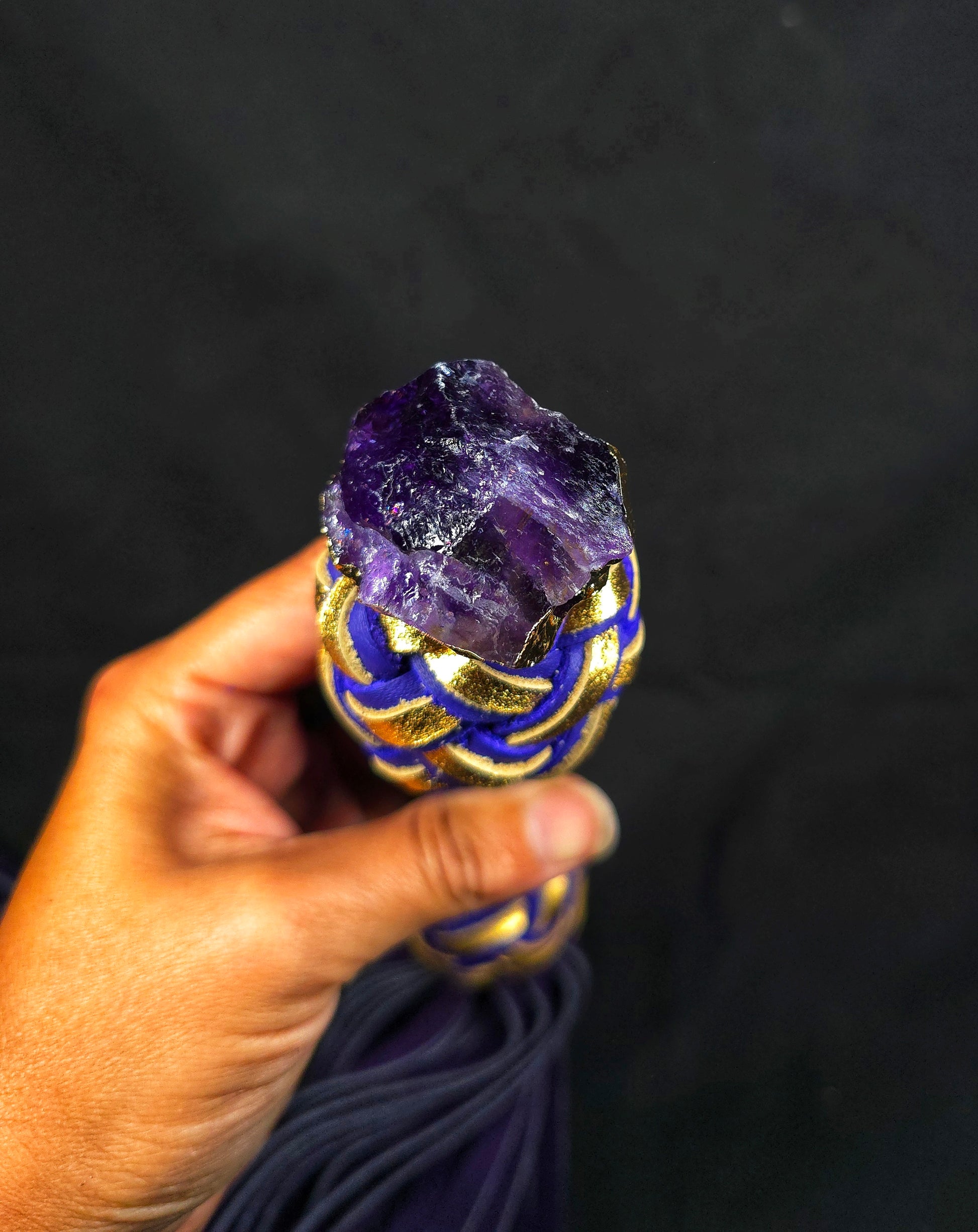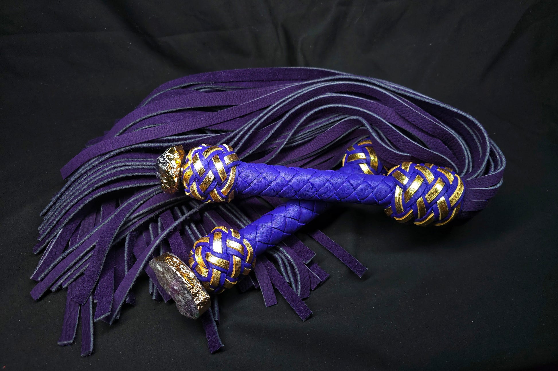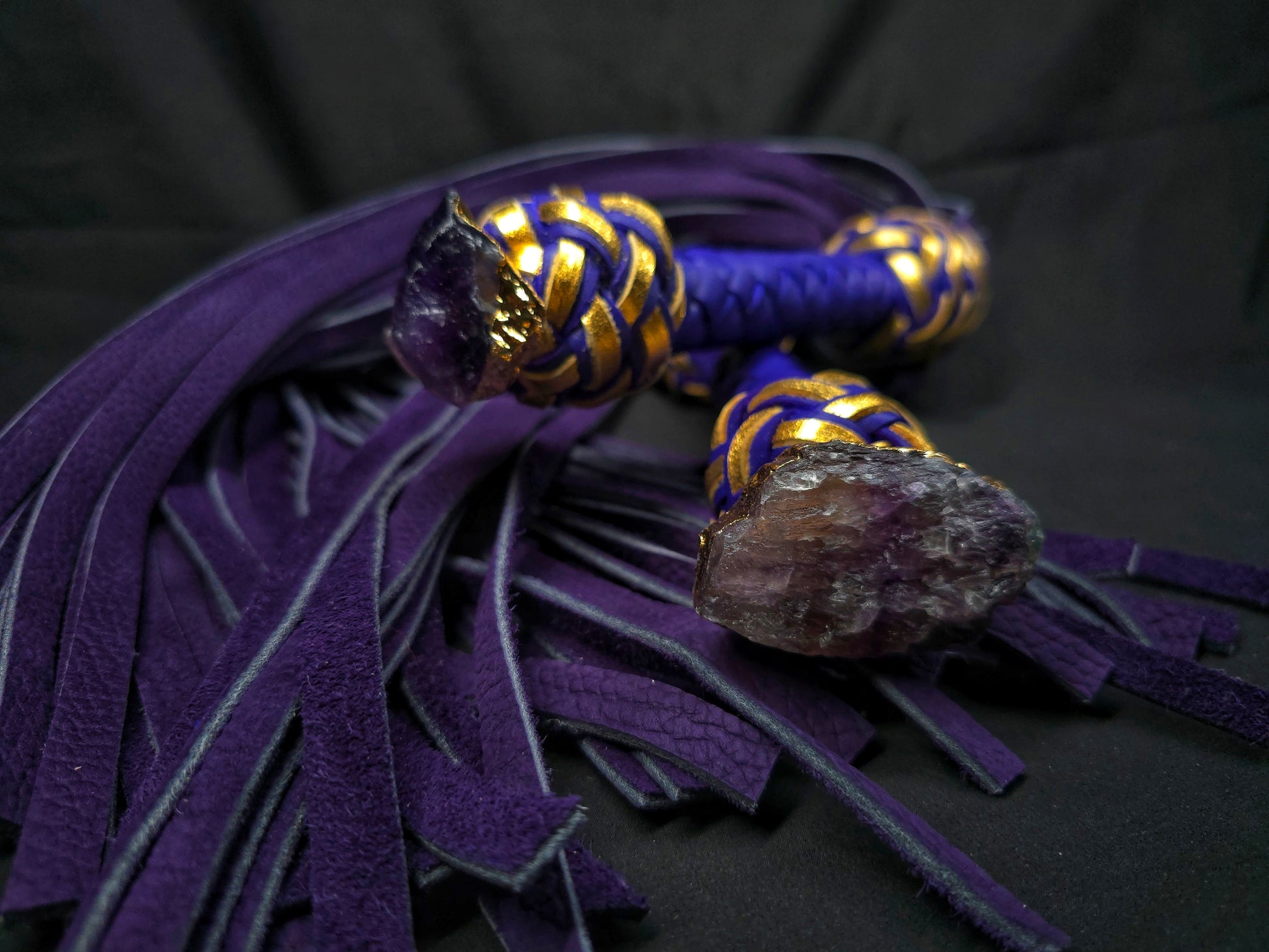 Velvet Leather is a custom leather made just for us in a tannery in France. It is super soft, with a velvety touch and is my replacement for elk. These floggers have purple amethyst crystal toppers.