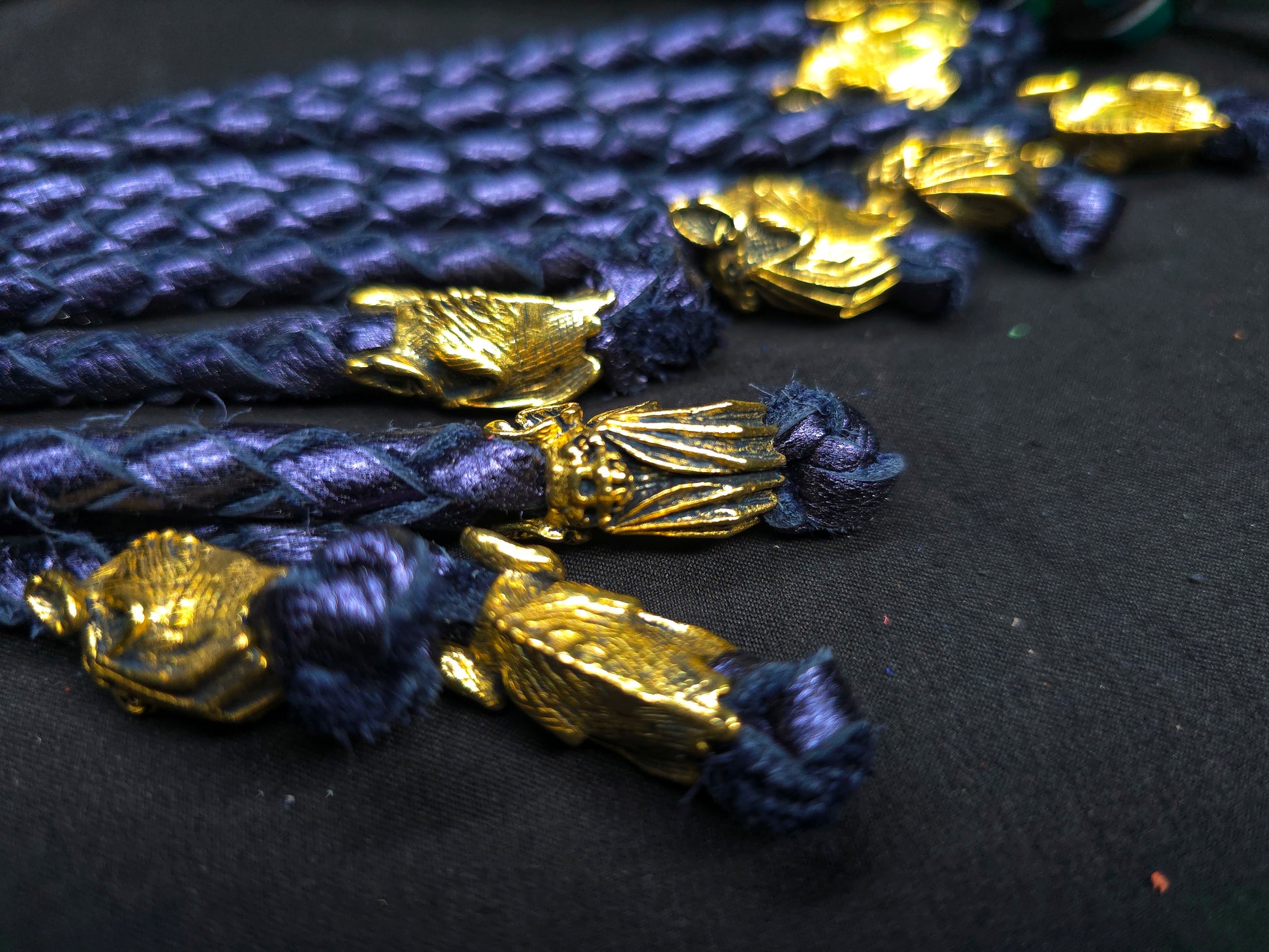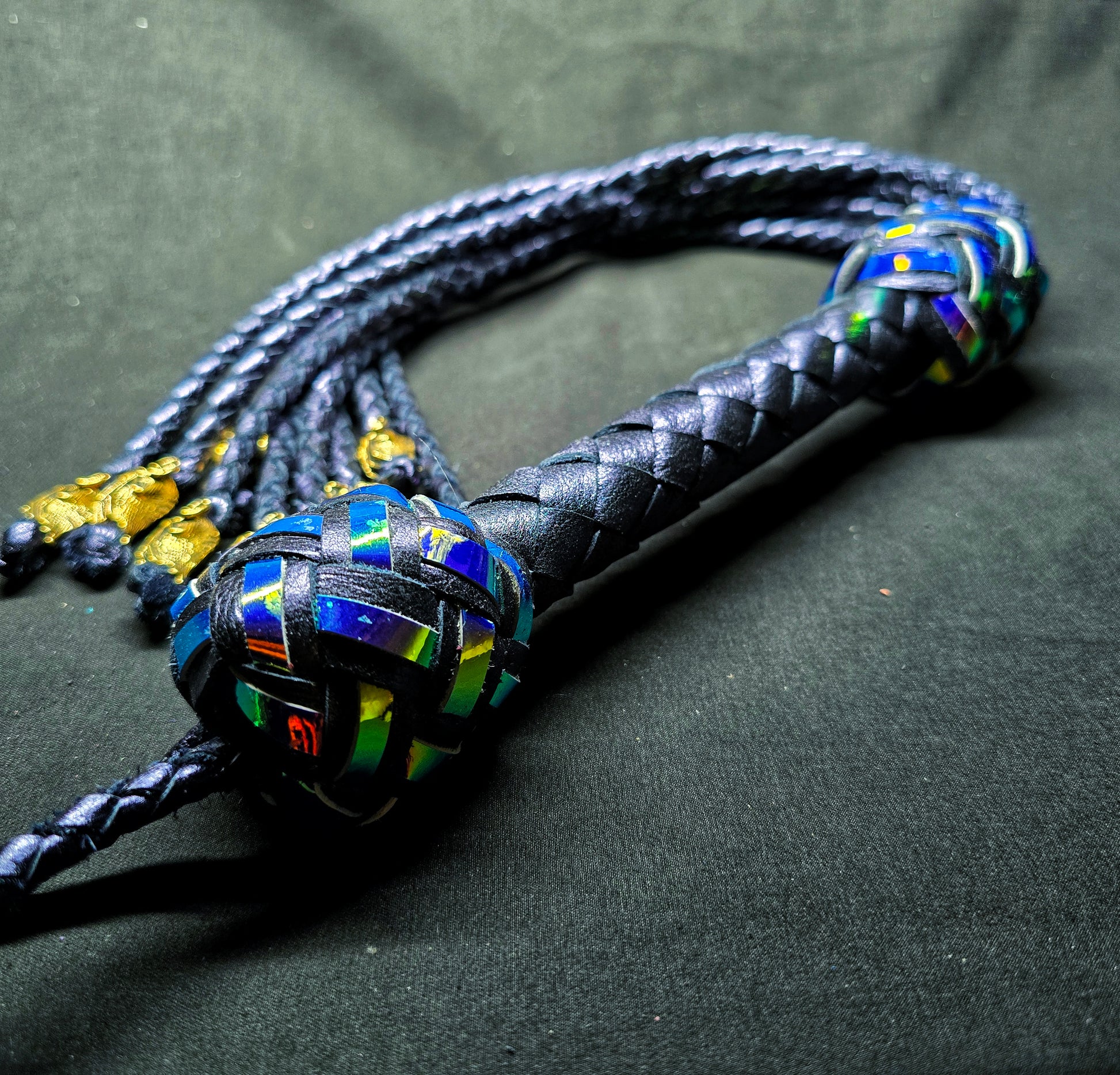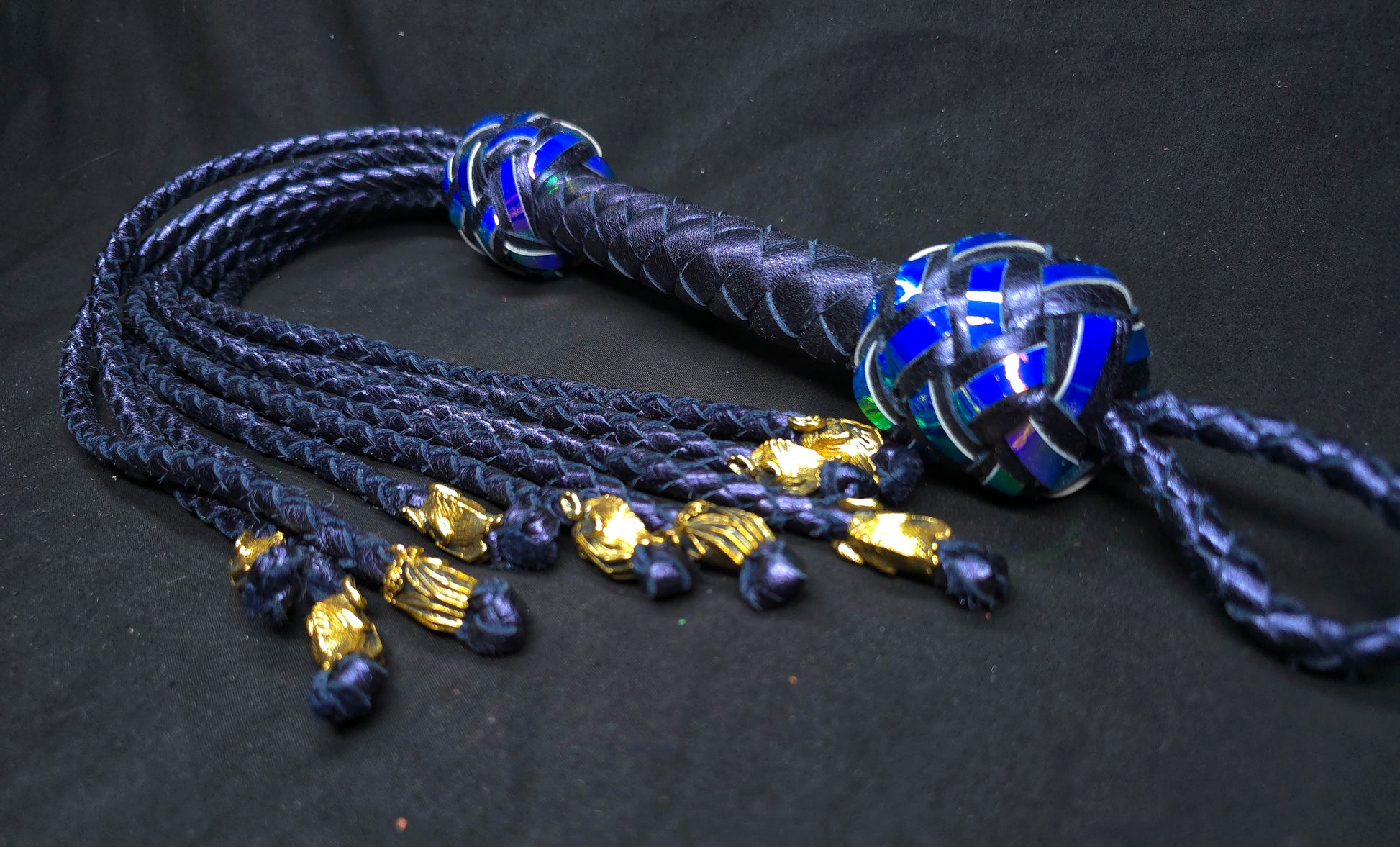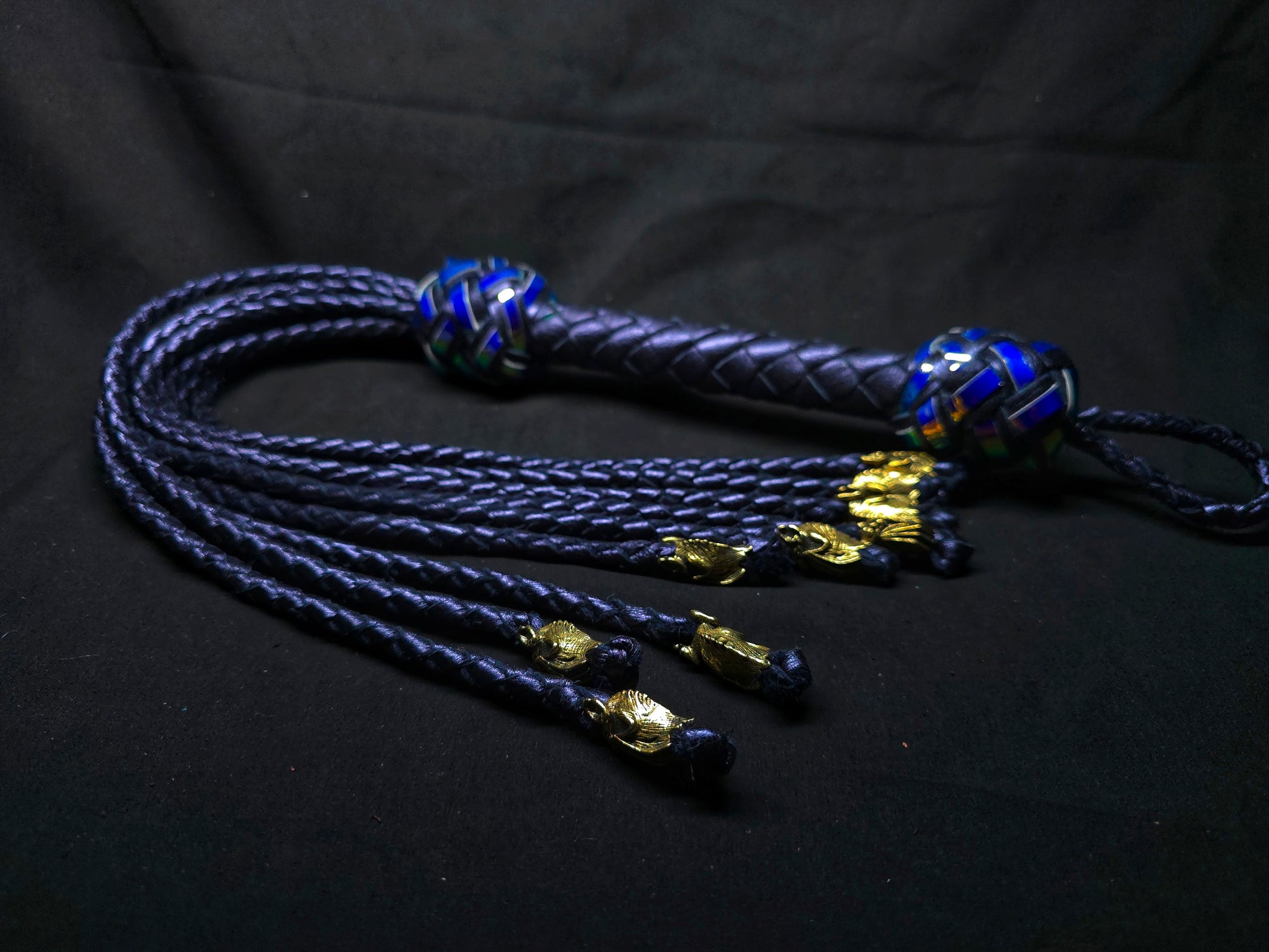 These cat o nines are not for the faint of heart. The bats are metal. Use common sense. The handles are braided in navy blue leather with a touch of metallic sunset in the knots. The handle is 8 inches long with a steel core. The tails are 20 inches long.