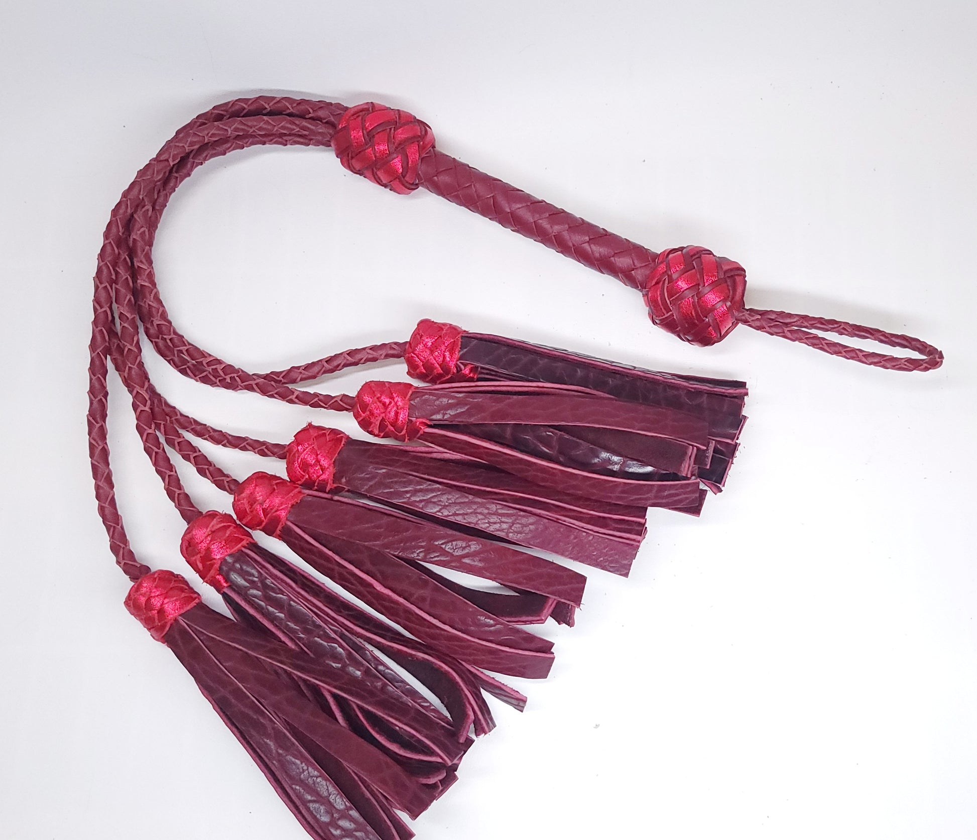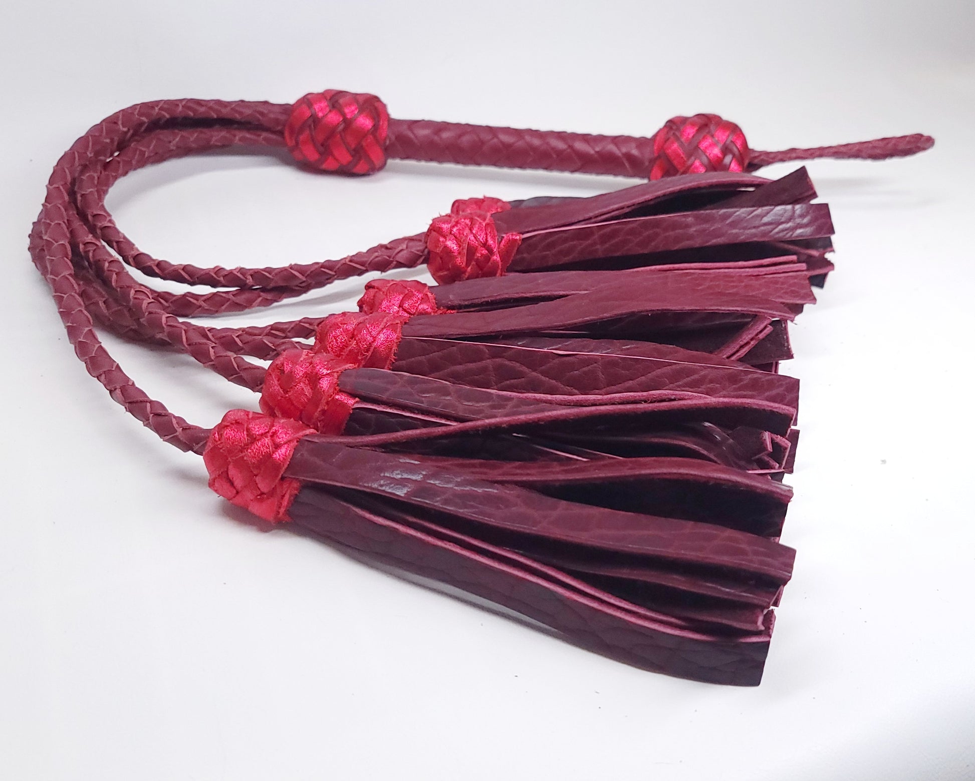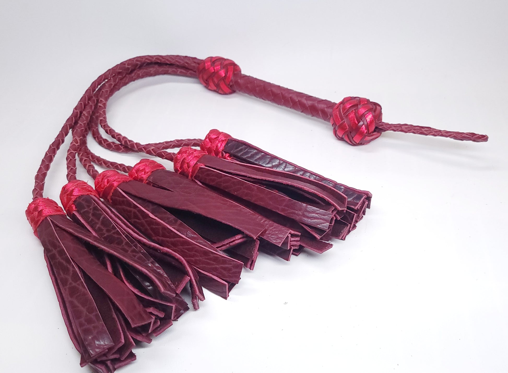 The black cherry leather has a wax pull up finish that shows off beautiful shades of red, burgundy, and black that will change over time as the flogger is used.