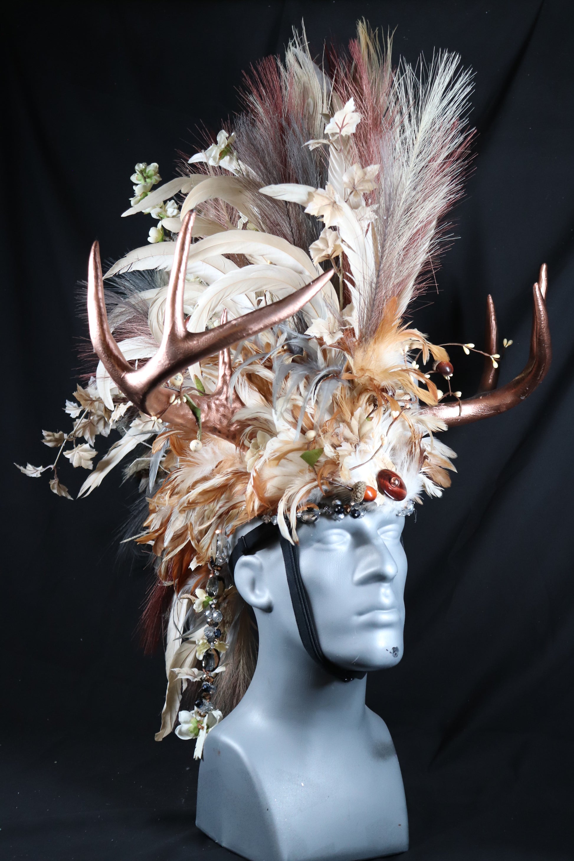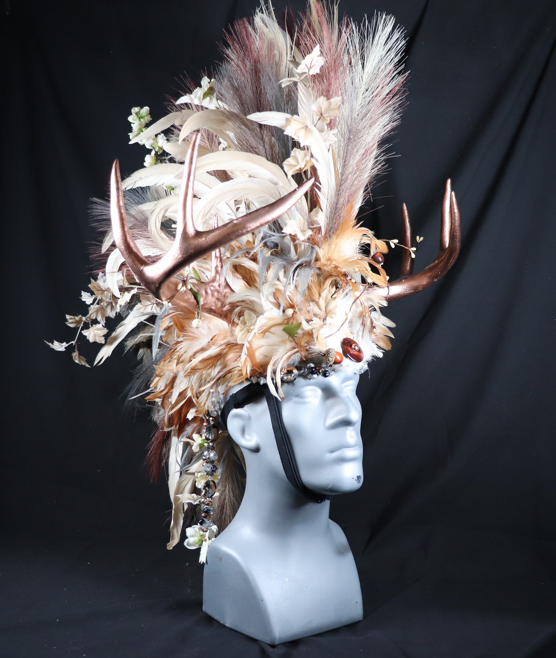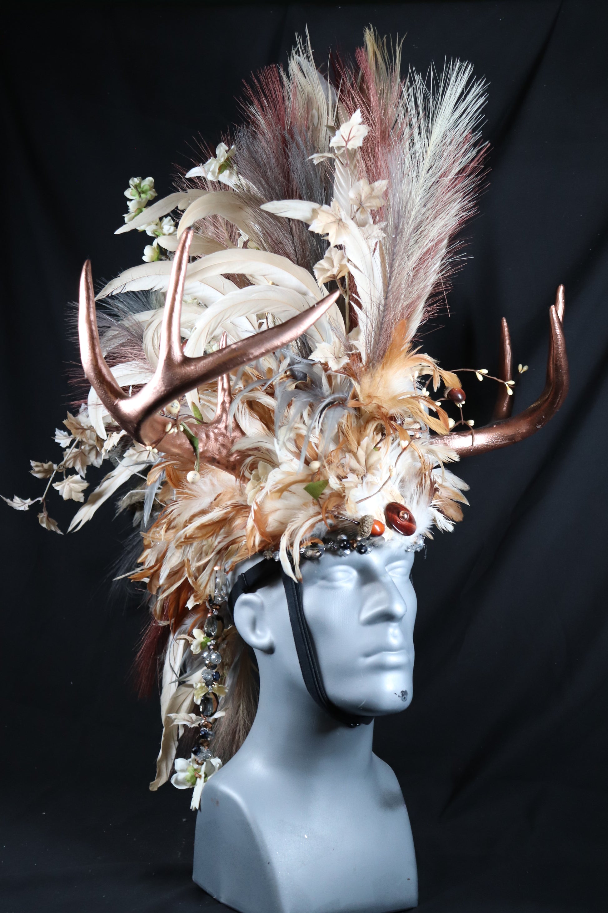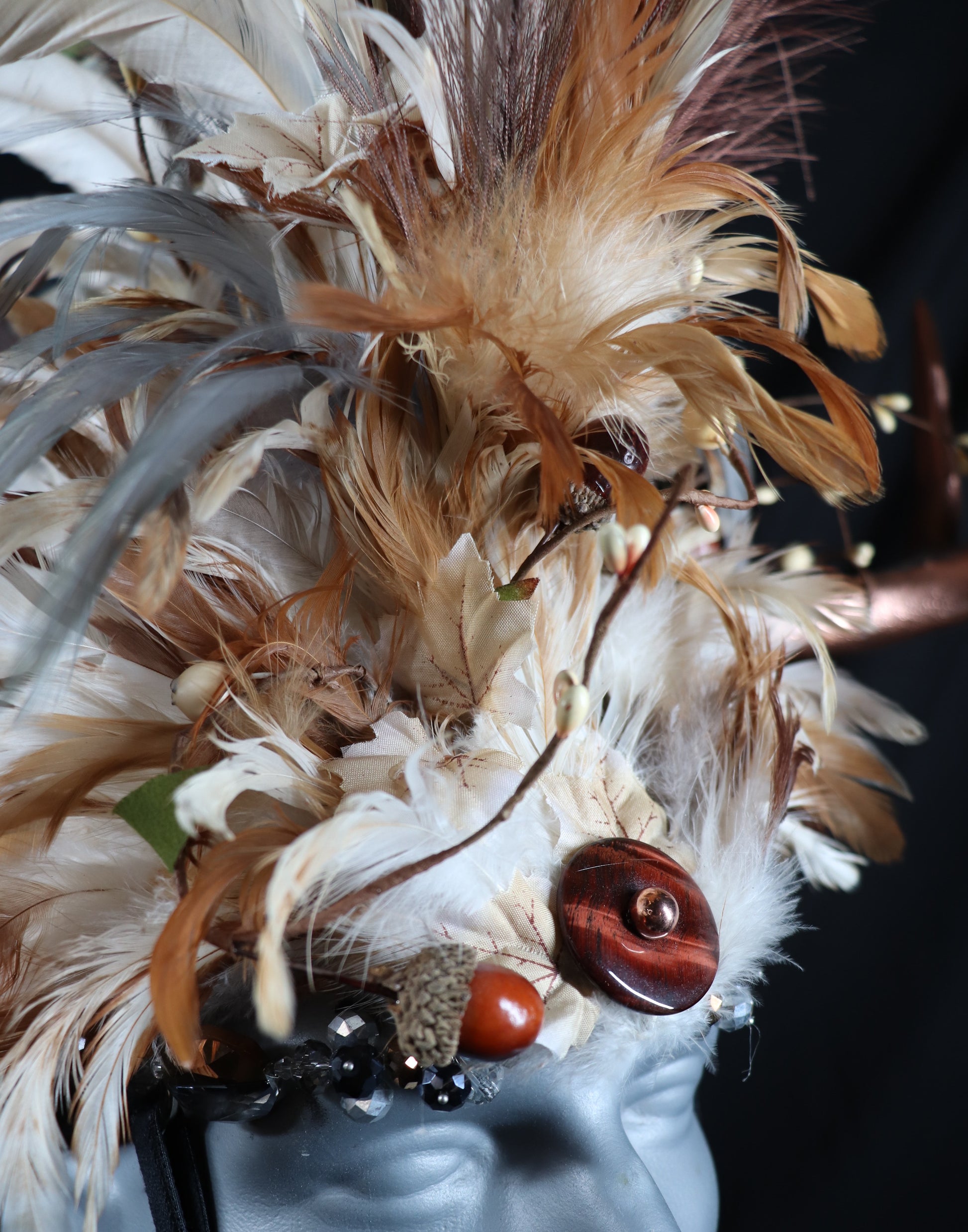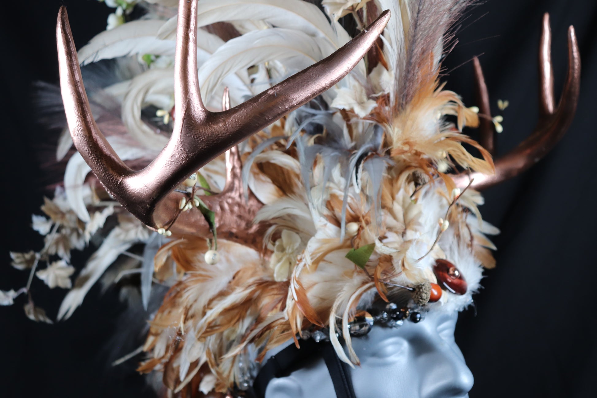 This headdress has copper deer antlers, a mix of a ton of different feathers and these soft swooshy bits, leaves, acorns, crystal cut beads, and a red tiger's eye center in front.