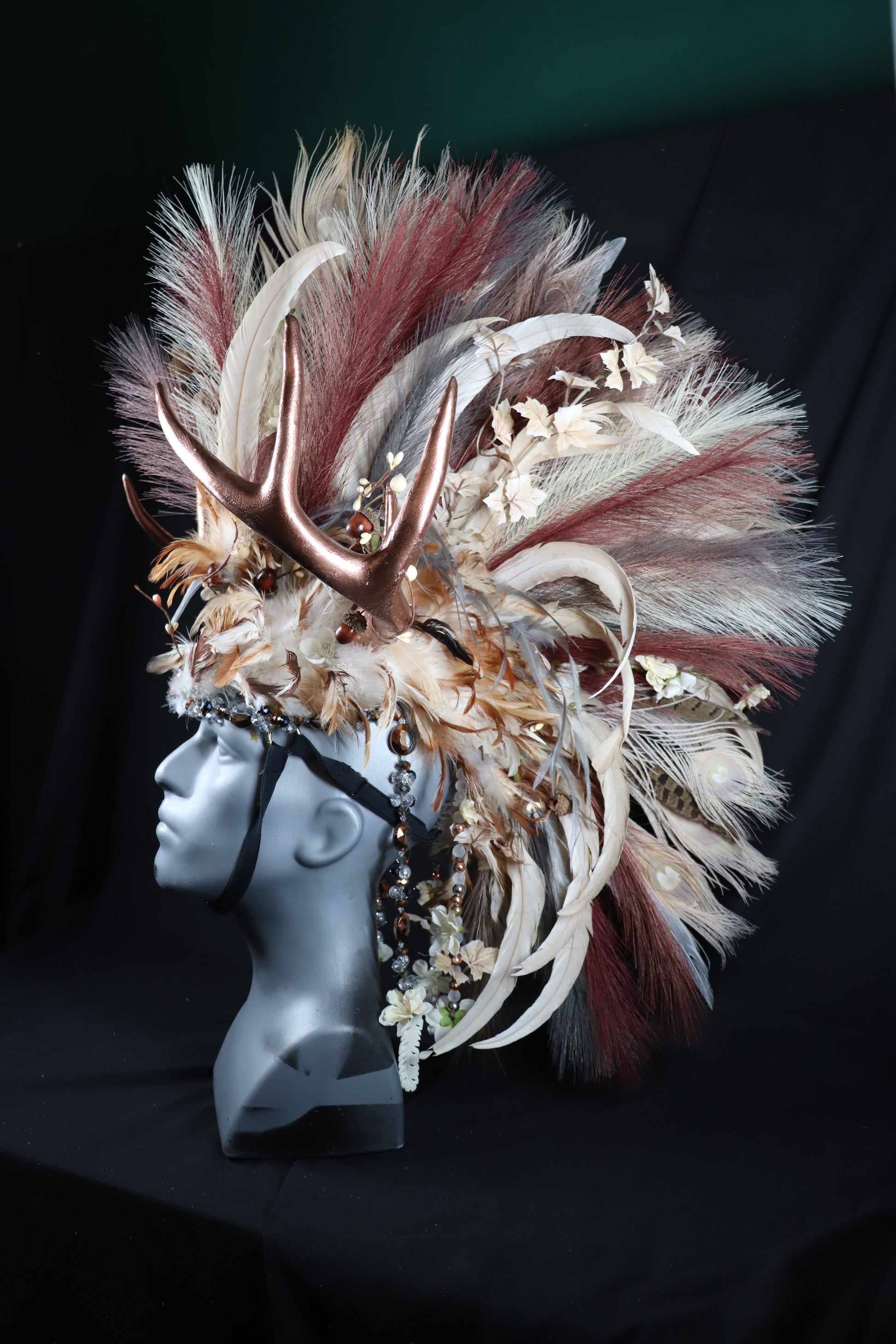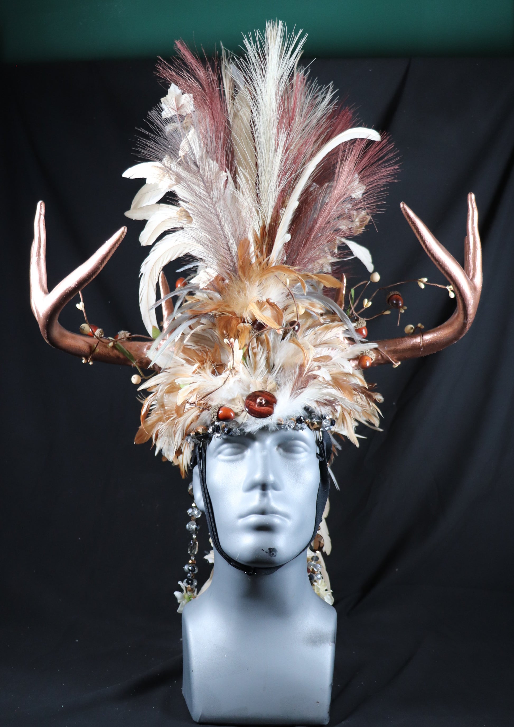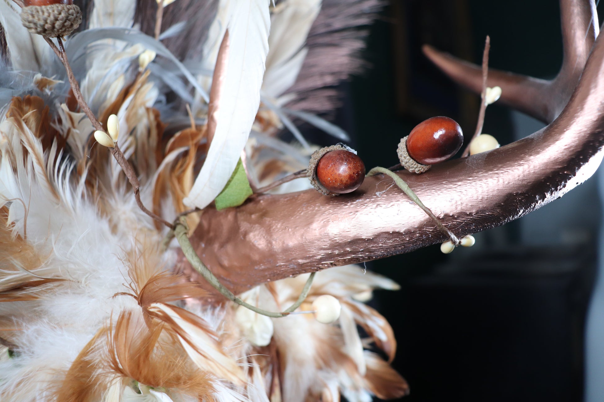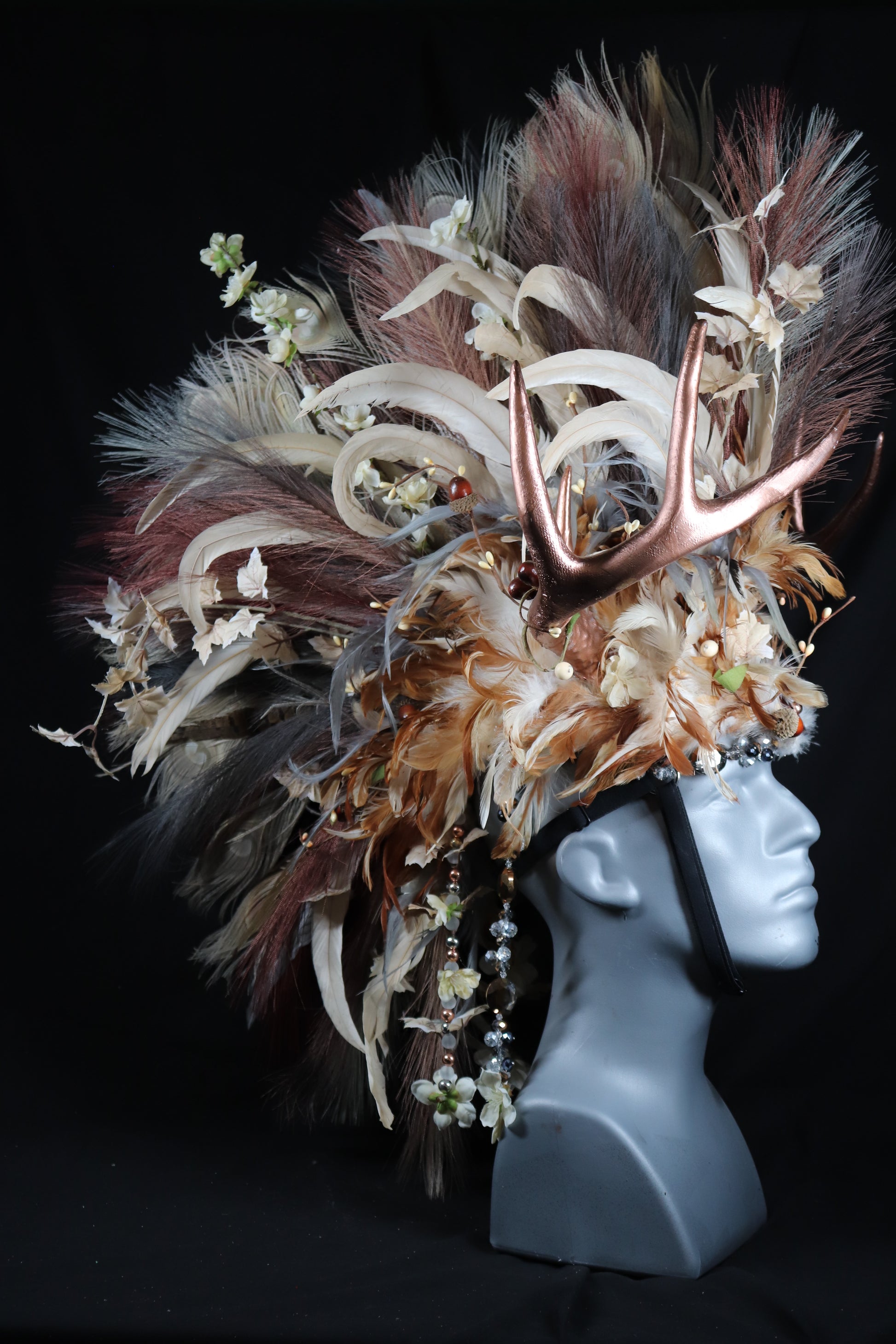 This headdress has copper deer antlers, a mix of a ton of different feathers and these soft swooshy bits, leaves, acorns, crystal cut beads, and a red tiger's eye center in front.