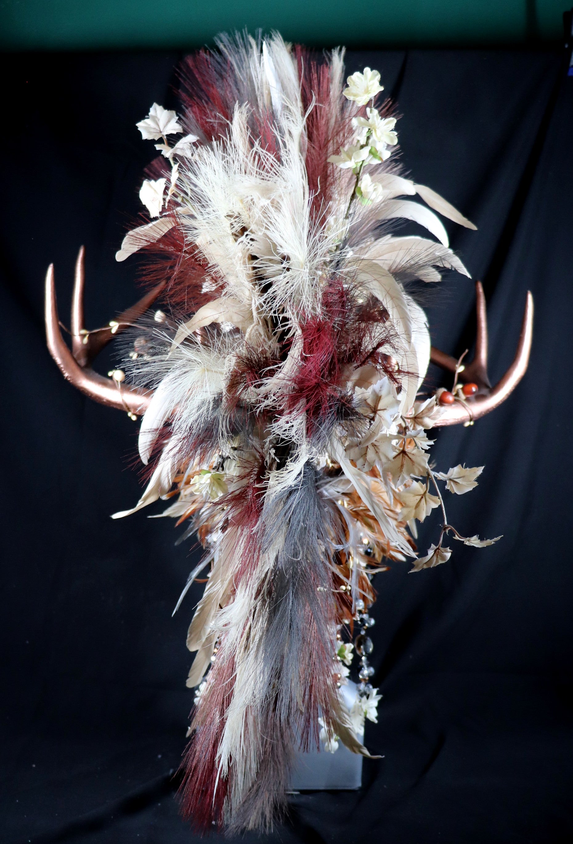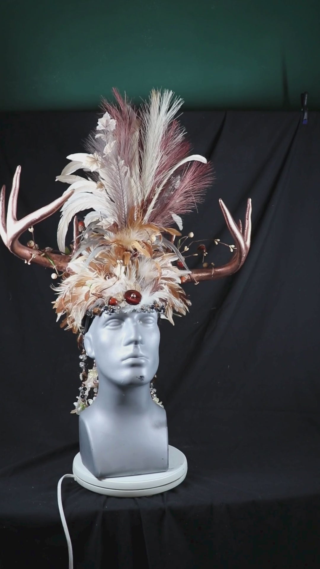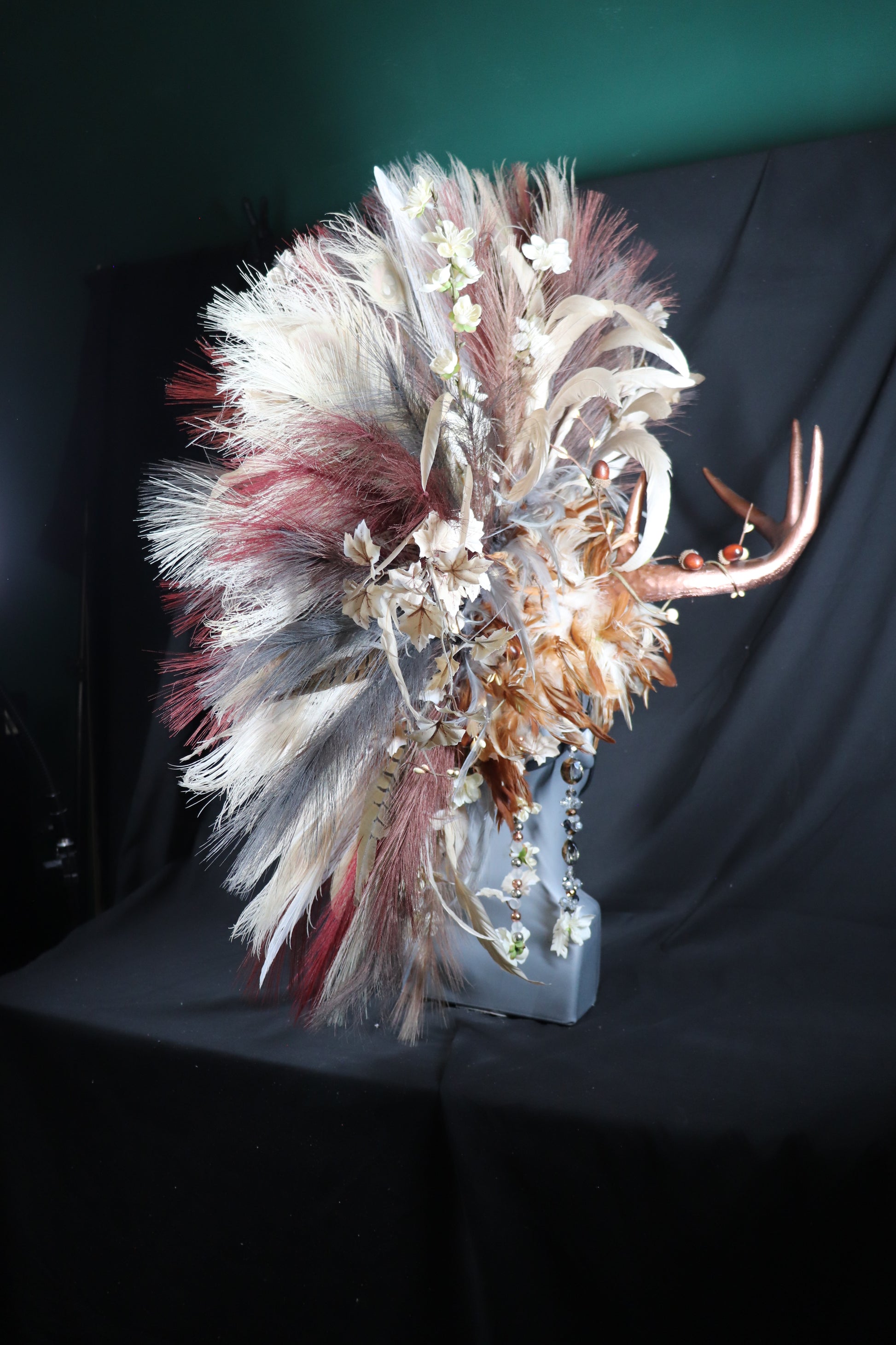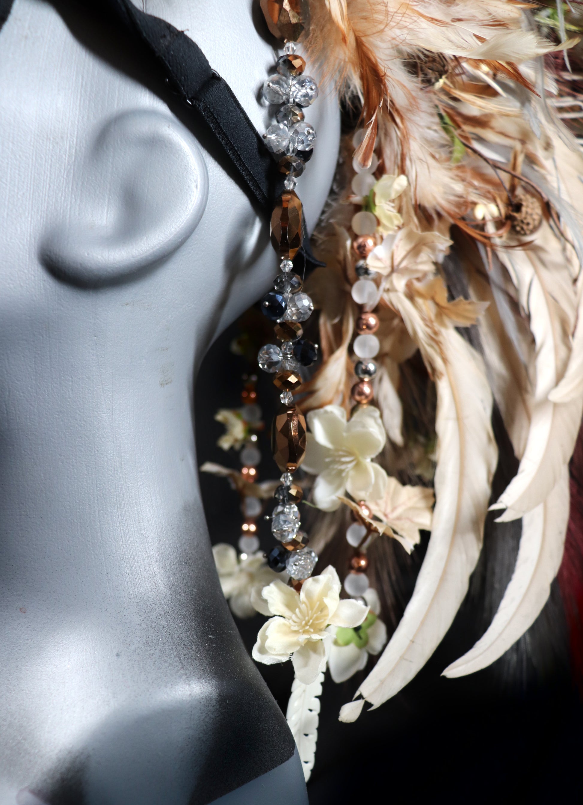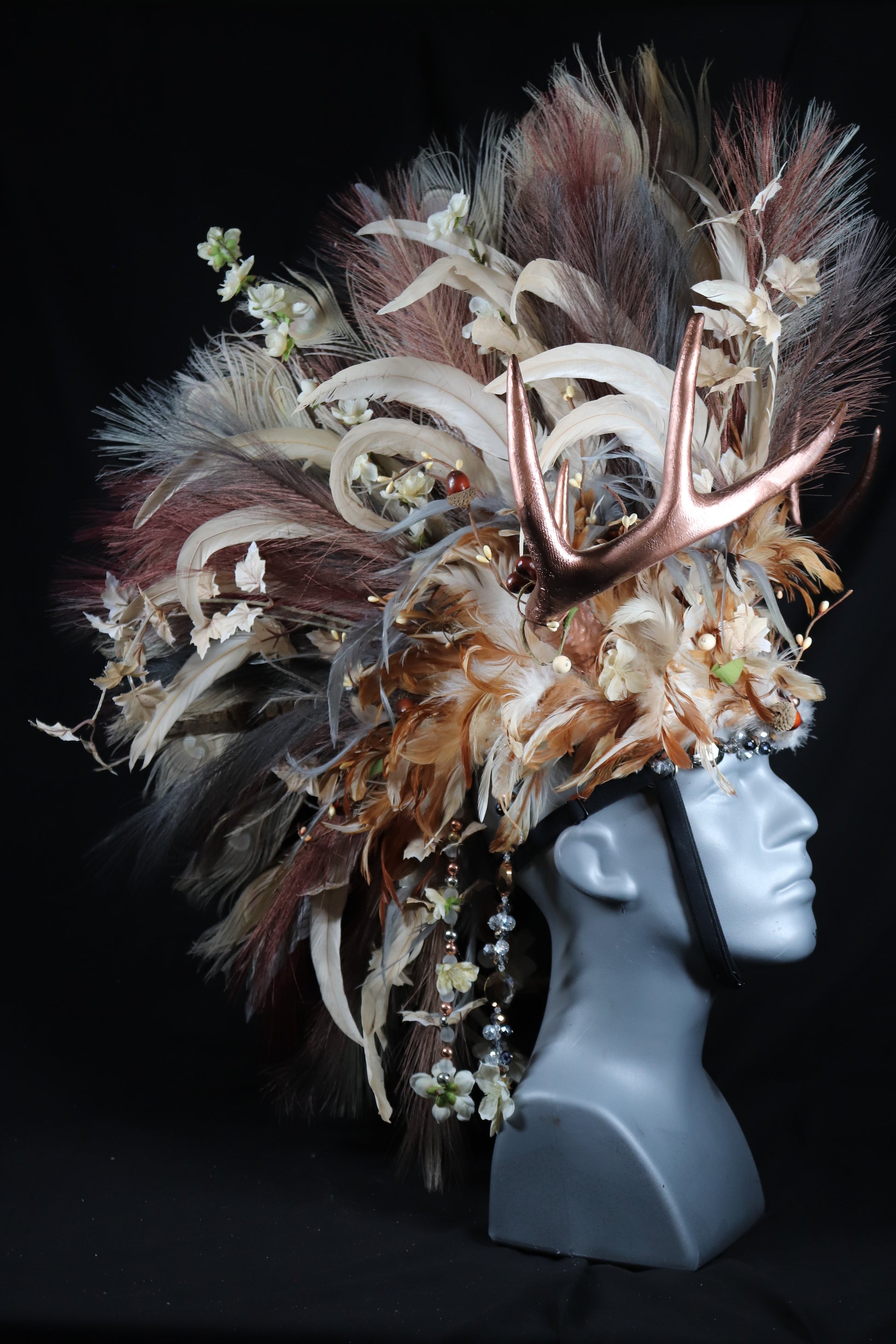 This headdress has copper deer antlers, a mix of a ton of different feathers and these soft swooshy bits, leaves, acorns, crystal cut beads, and a red tiger's eye center in front.