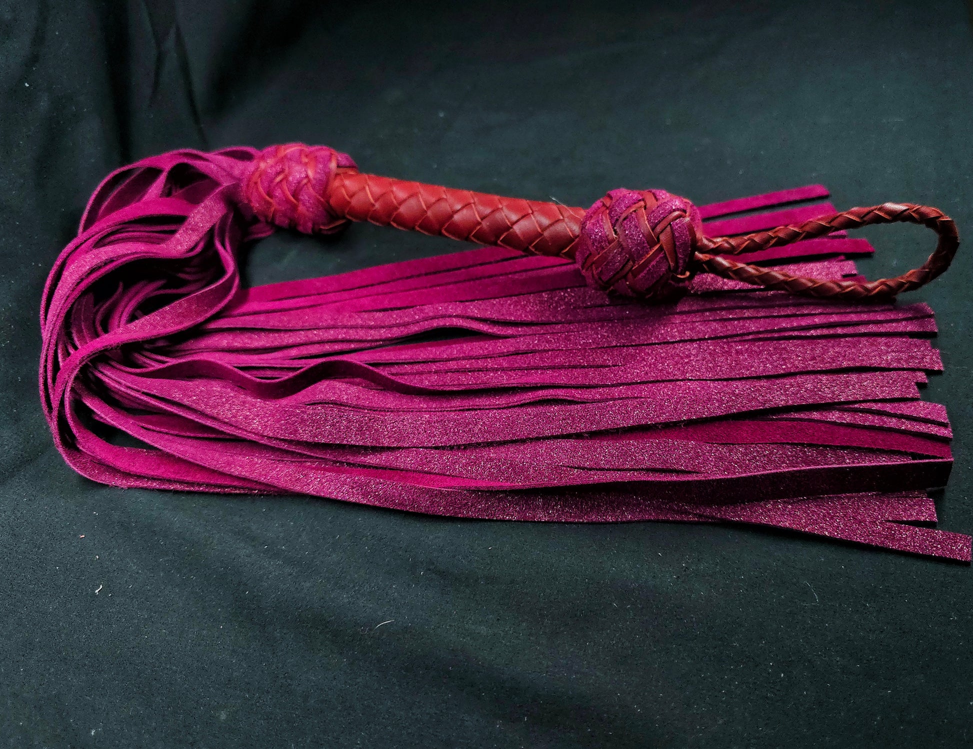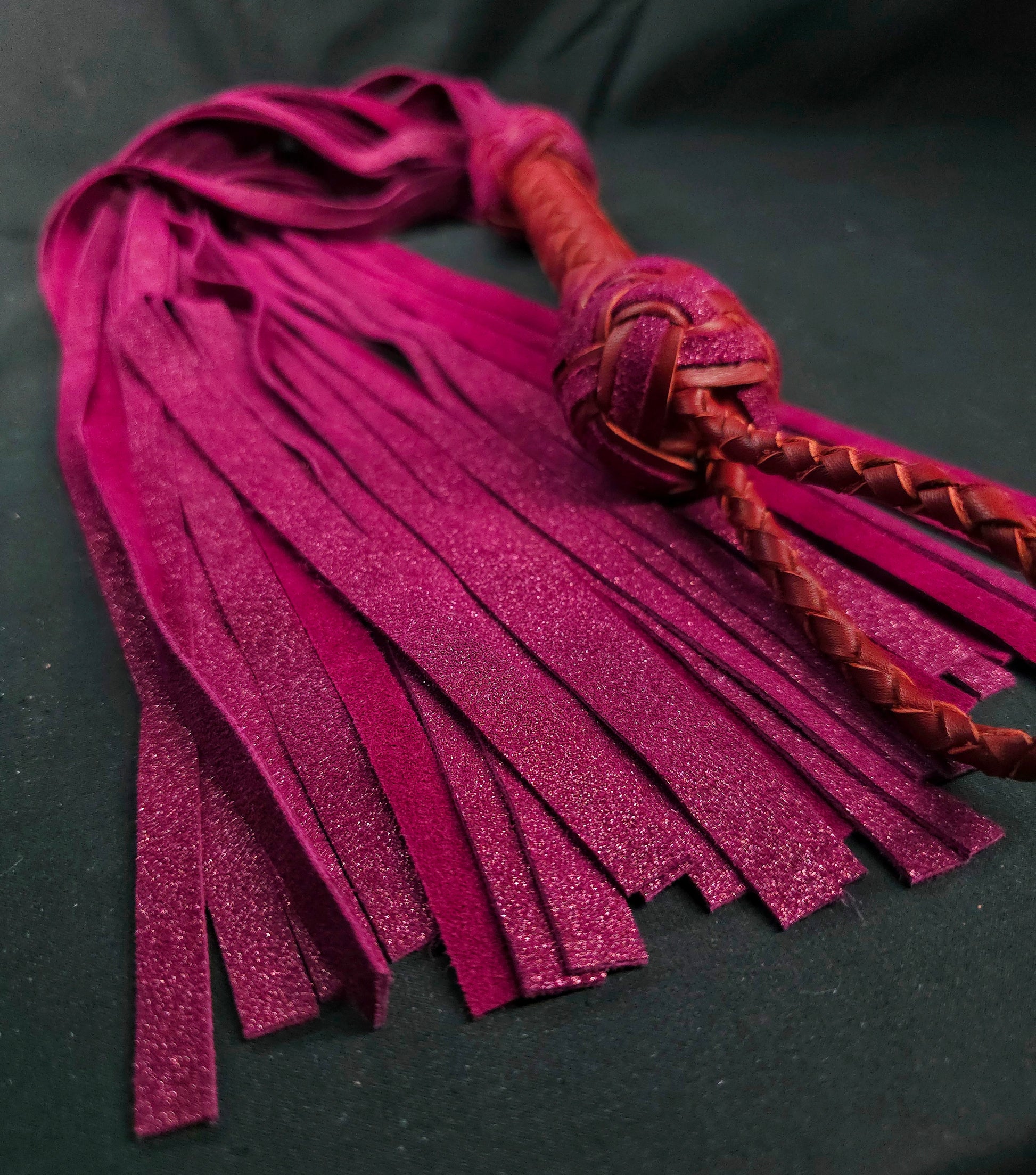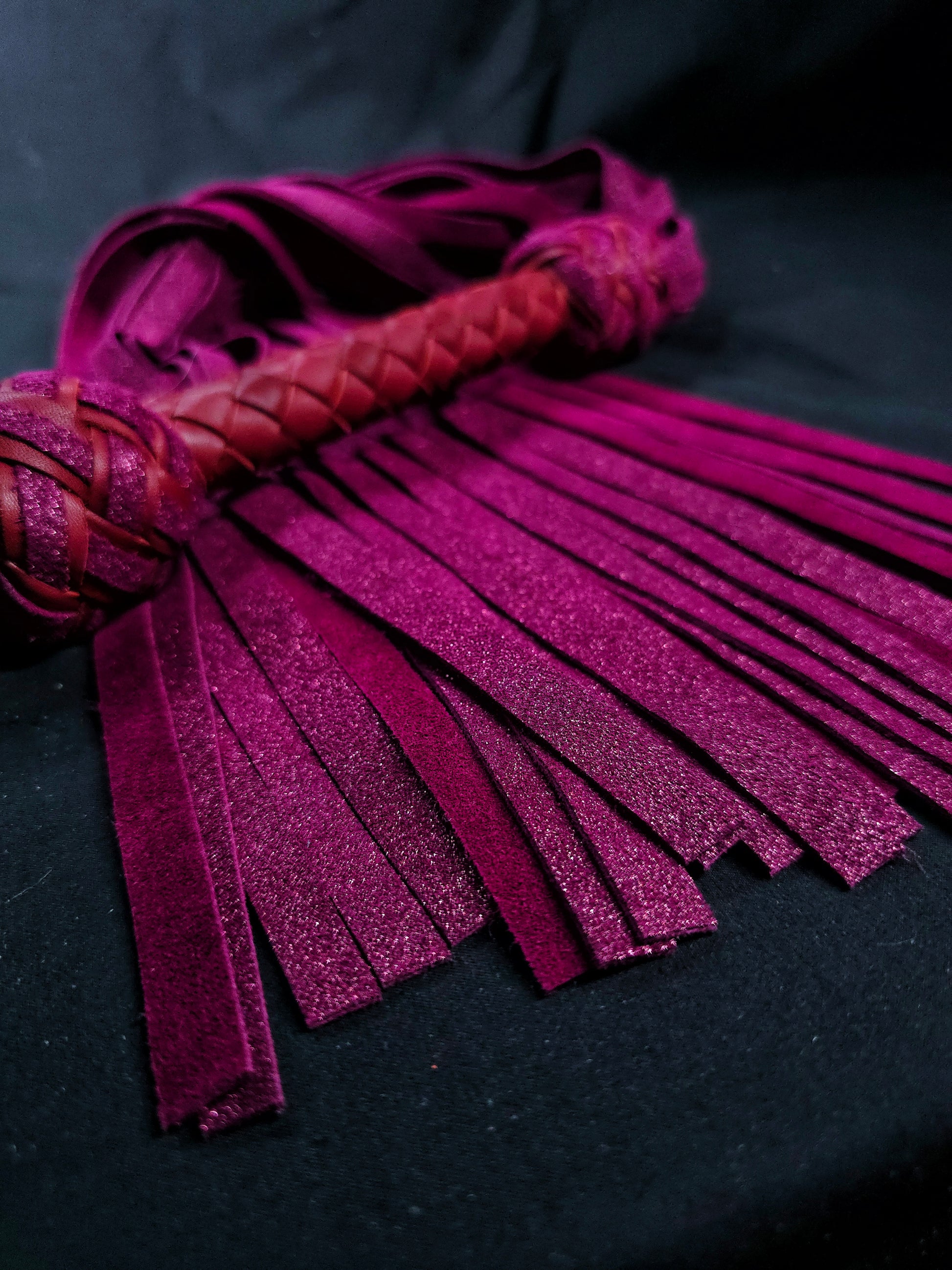 This leather is a gorgeous burgundy color with a light silver shimmer on one side. The shimmer is digitally printed onto the leather and will not flake off and infect your dungeon, or your partner, with glitter.