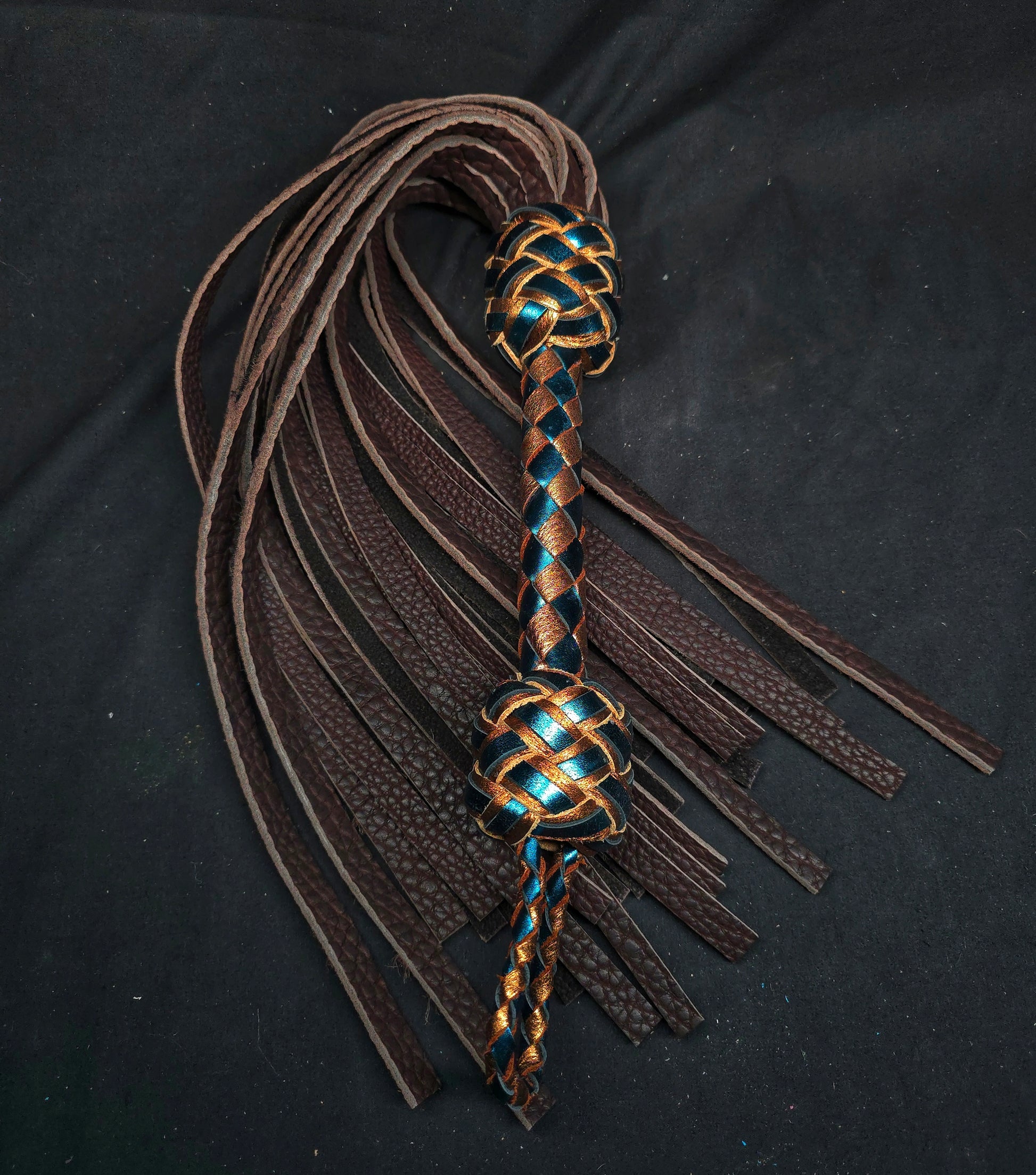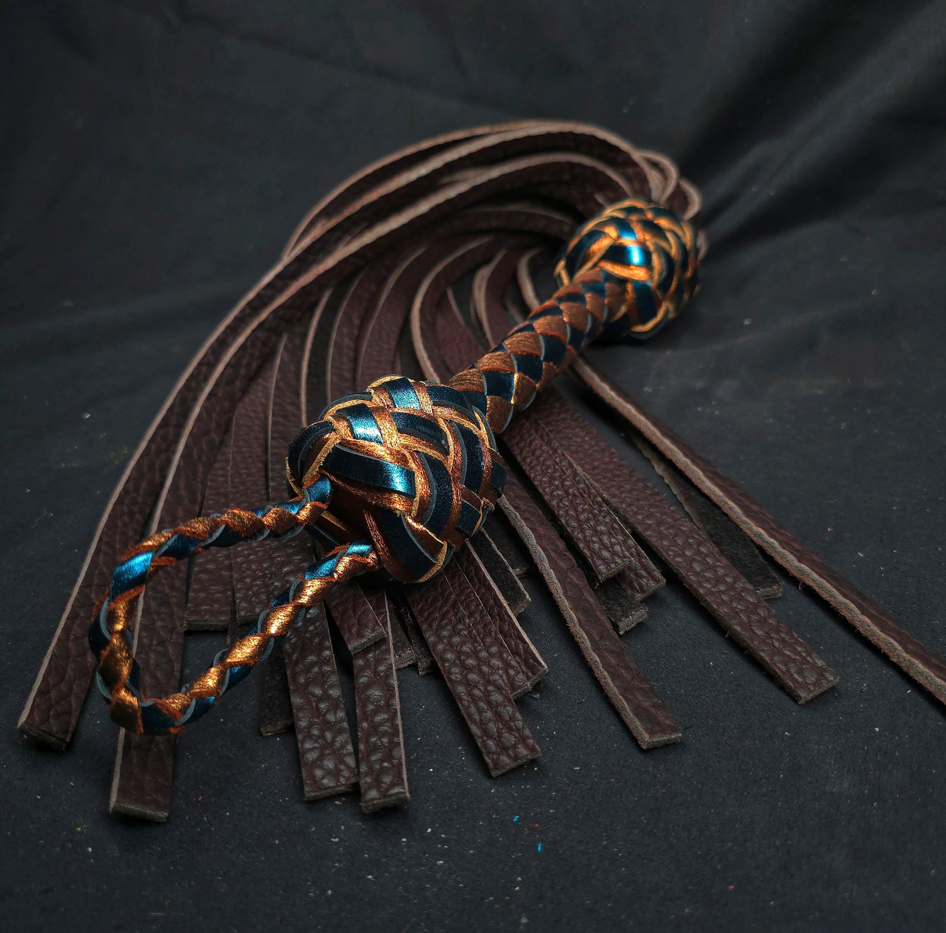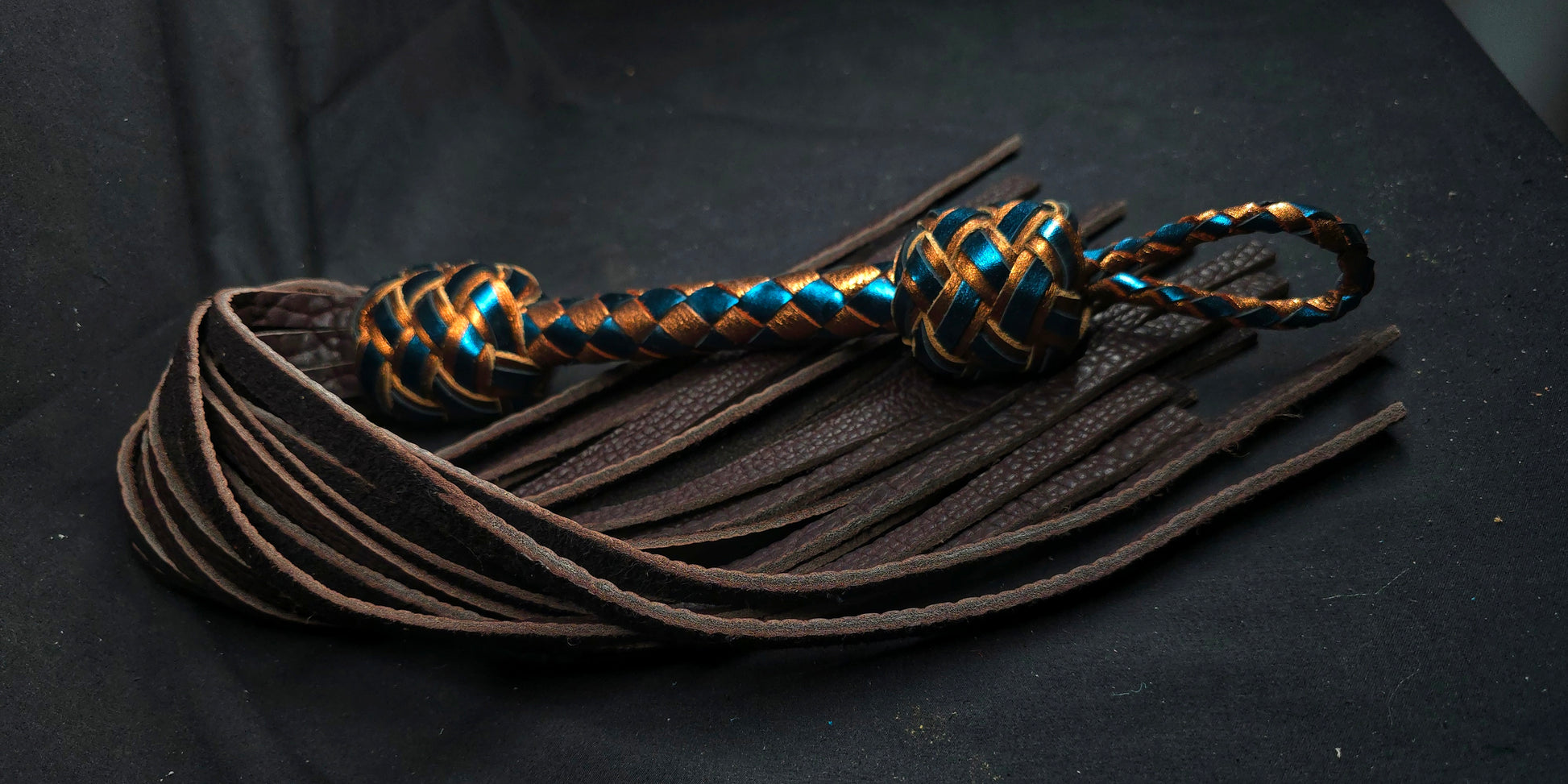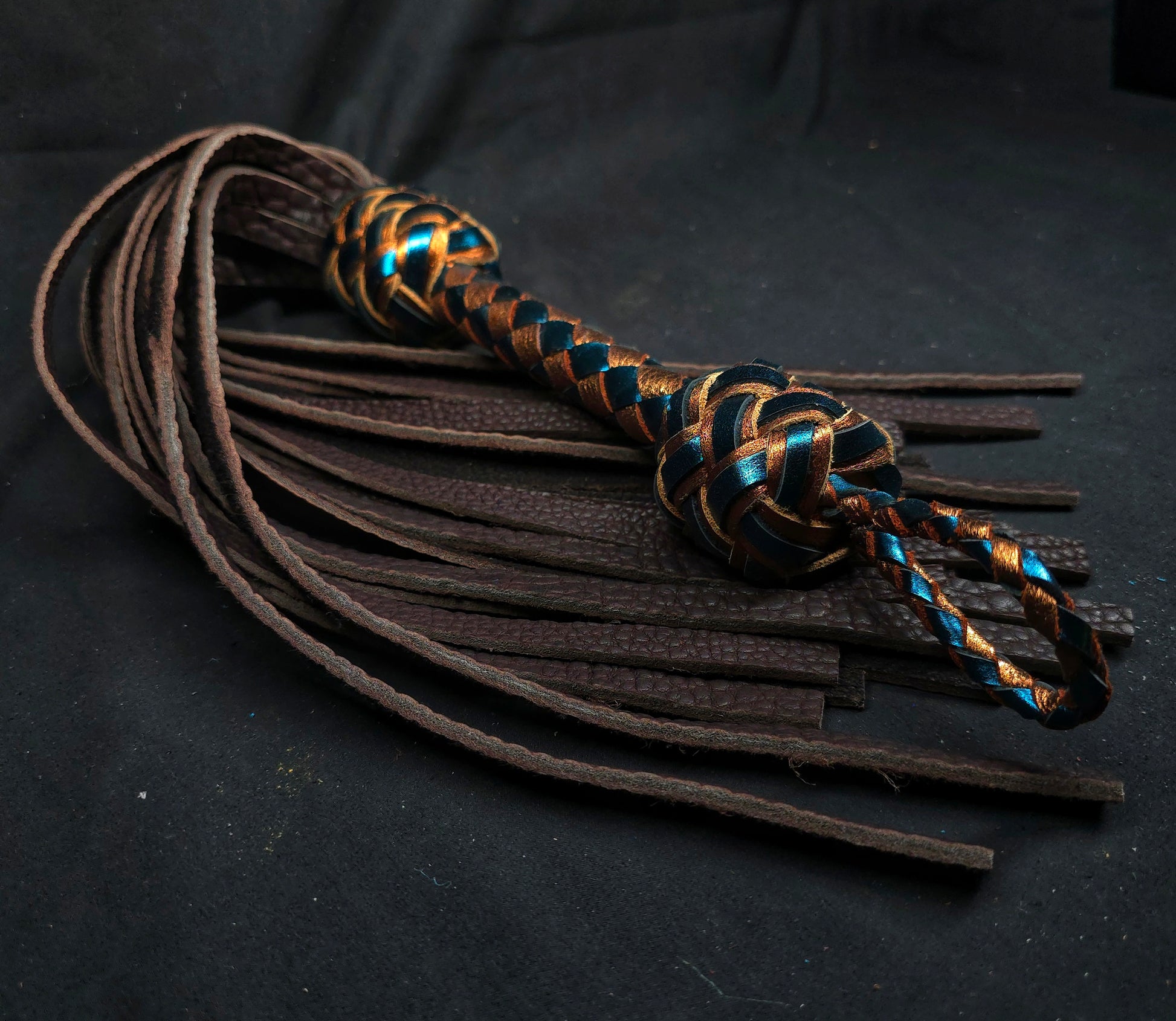 Bison is one of our thickest and thuddiest leathers. This flogger has tails in a rich chocolate brown color and a handle braided in bronze and dark blue green leather.