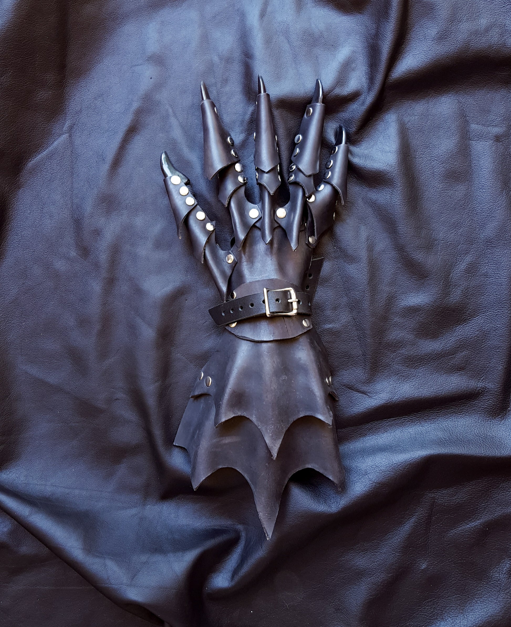 The gauntlet is made from hand molded and leather. It is high quality, durable and lightweight. Each piece of leather holds its shape on its own. This piece is not made from thin leather that has simply been folded over the claws and riveted in place, each piece is cut, molded and dyed individually.