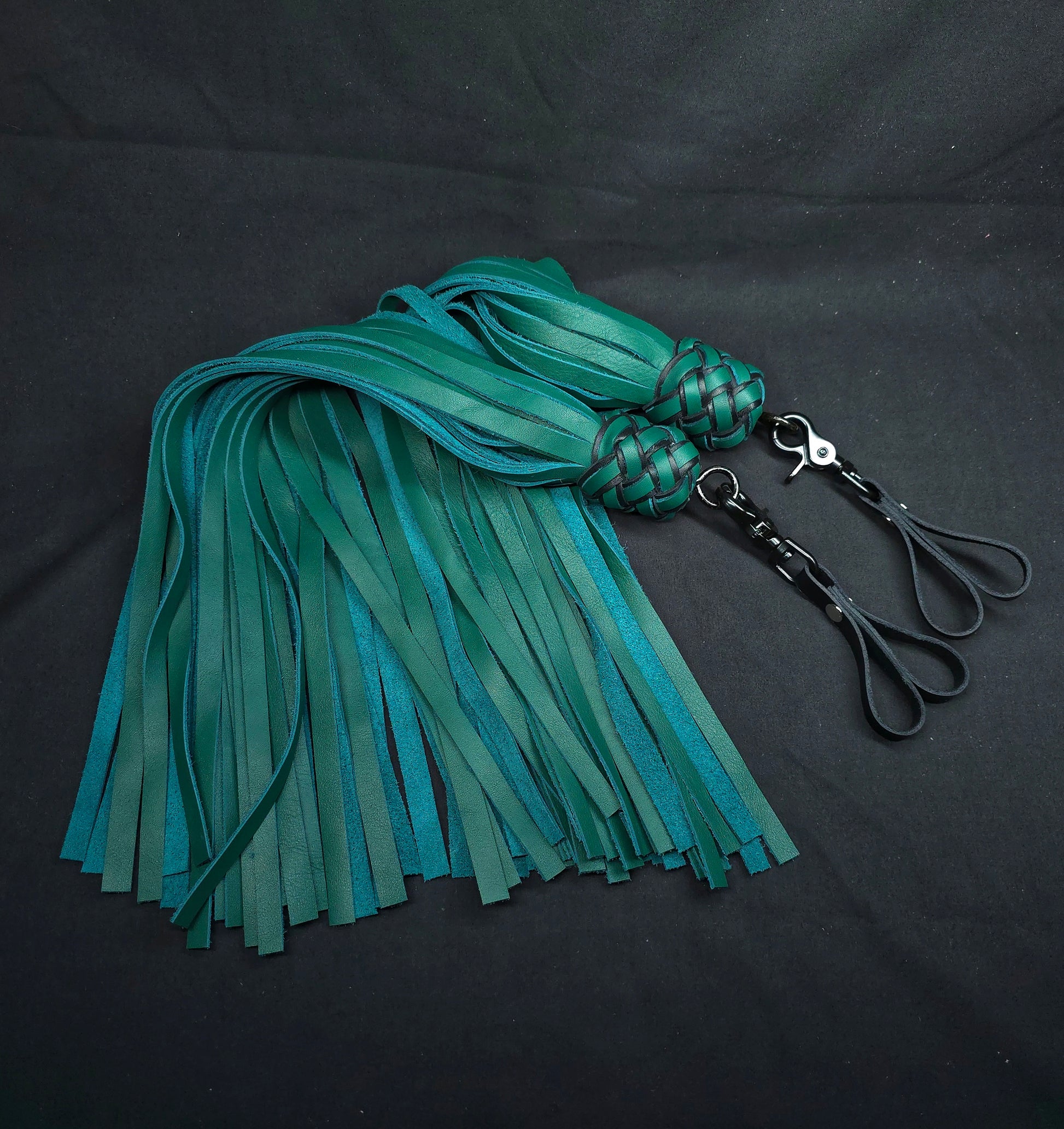 I would recommend these for light impact play. The tails are 18 inches long. The handles are made from latigo leather with steel swiveling hardware.