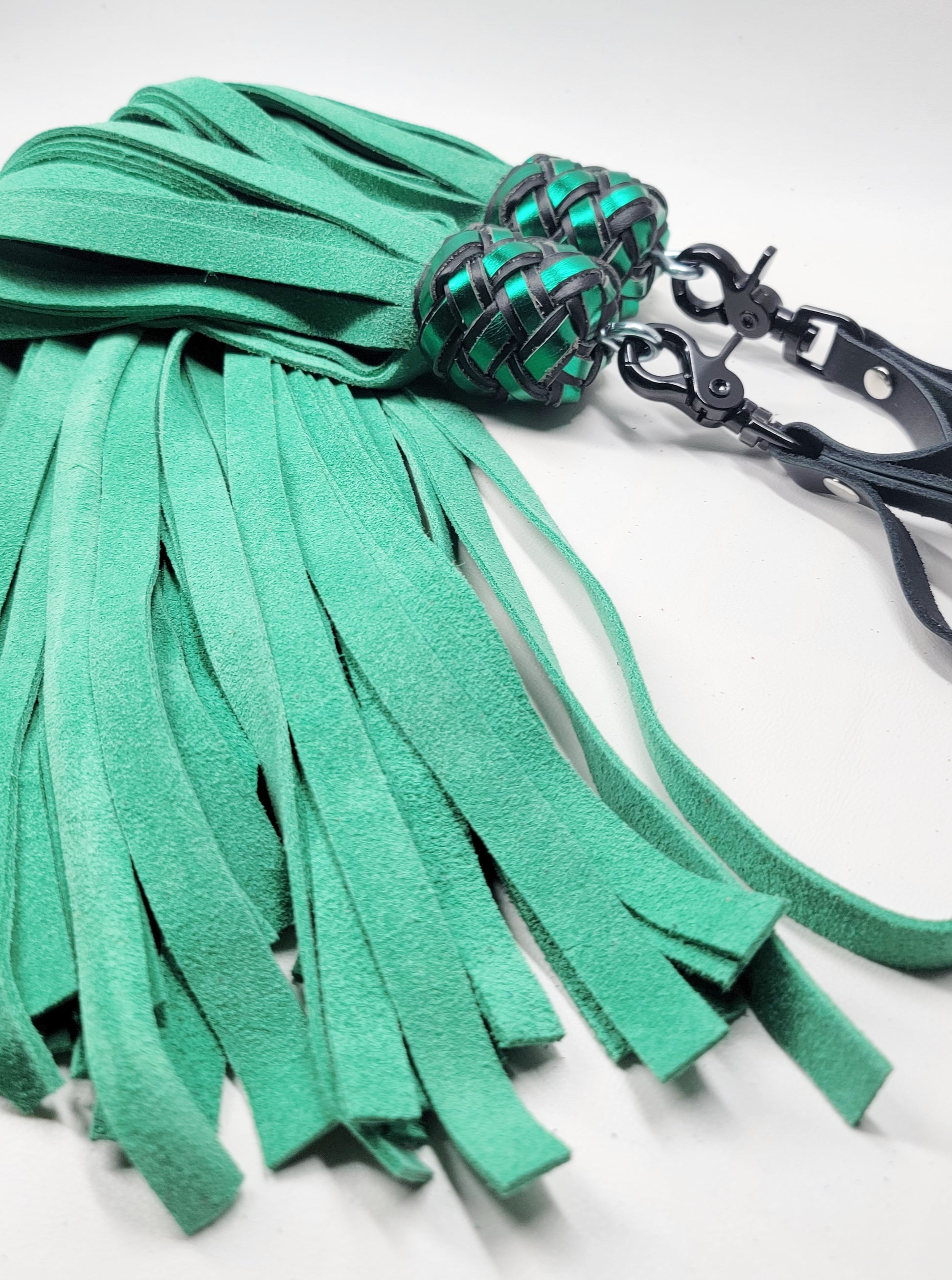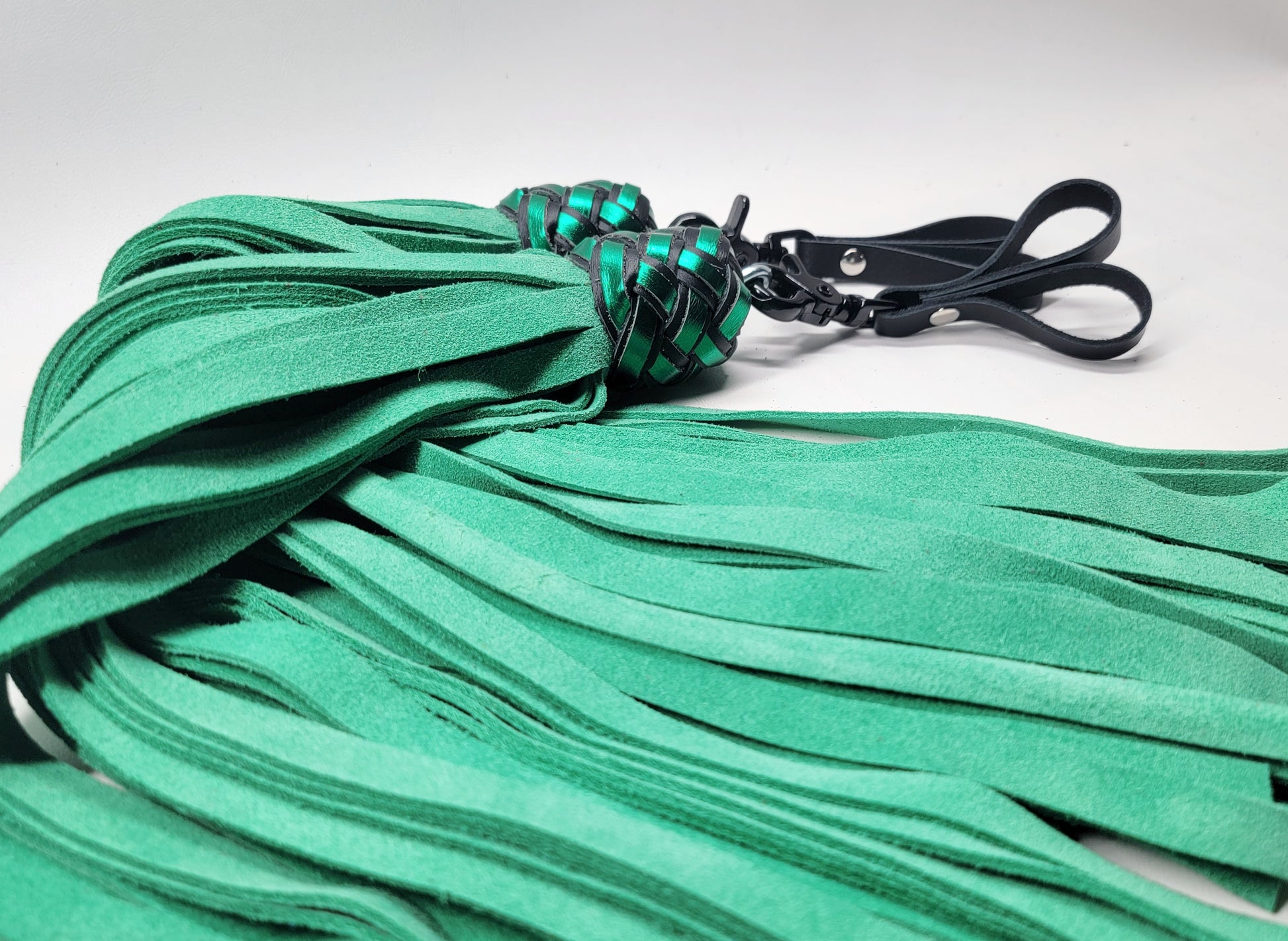 Suede, commonly referred to among leatherworkers as a split, is a layer of leather that has been sliced from the hide like a slice of deli meat would be sliced. Leather hides are very thick and part of the tanning process is to slice them to a useable thinness. These underside layers are "fuzzy" on both sides like the flesh side of a regular piece of leather. They hold vibrant dyes very well and the thicker types of suede, like the cowhide suede used here, make great floggers.
