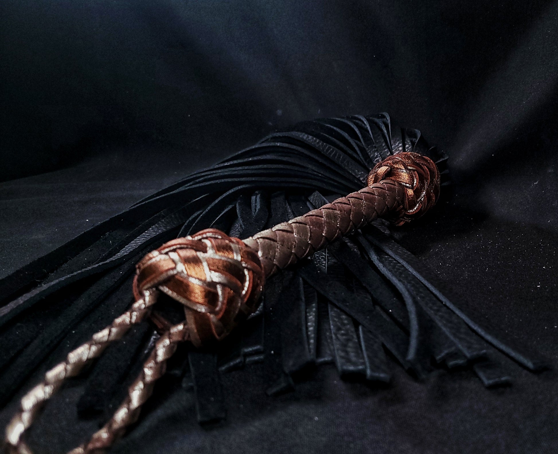 The handles are braided in distressed pewter metallic. The knots are laced with metallic bronze. The cores of these floggers are steel and while they are balanced the balance point rides a little low at the top of the bottom knot.