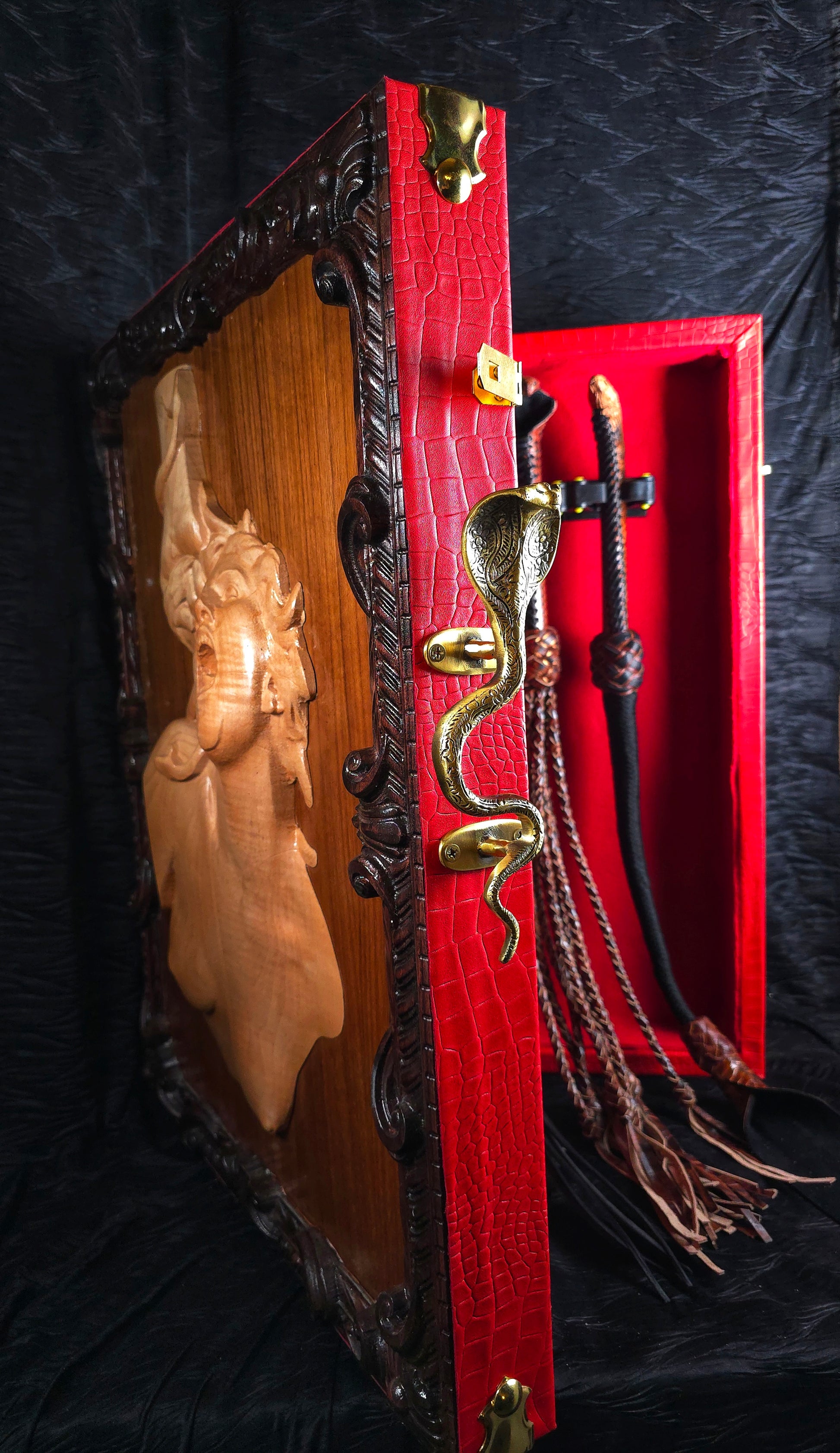 The front of the case is made from three separate pieces of wood carved from maple and mounted on black walnut . The rest of the case is also made of wood and the sides are covered in red alligator embossed leather. It has a soft touch and is finished with brass hardware including a brass cobra handle and locking hasp.