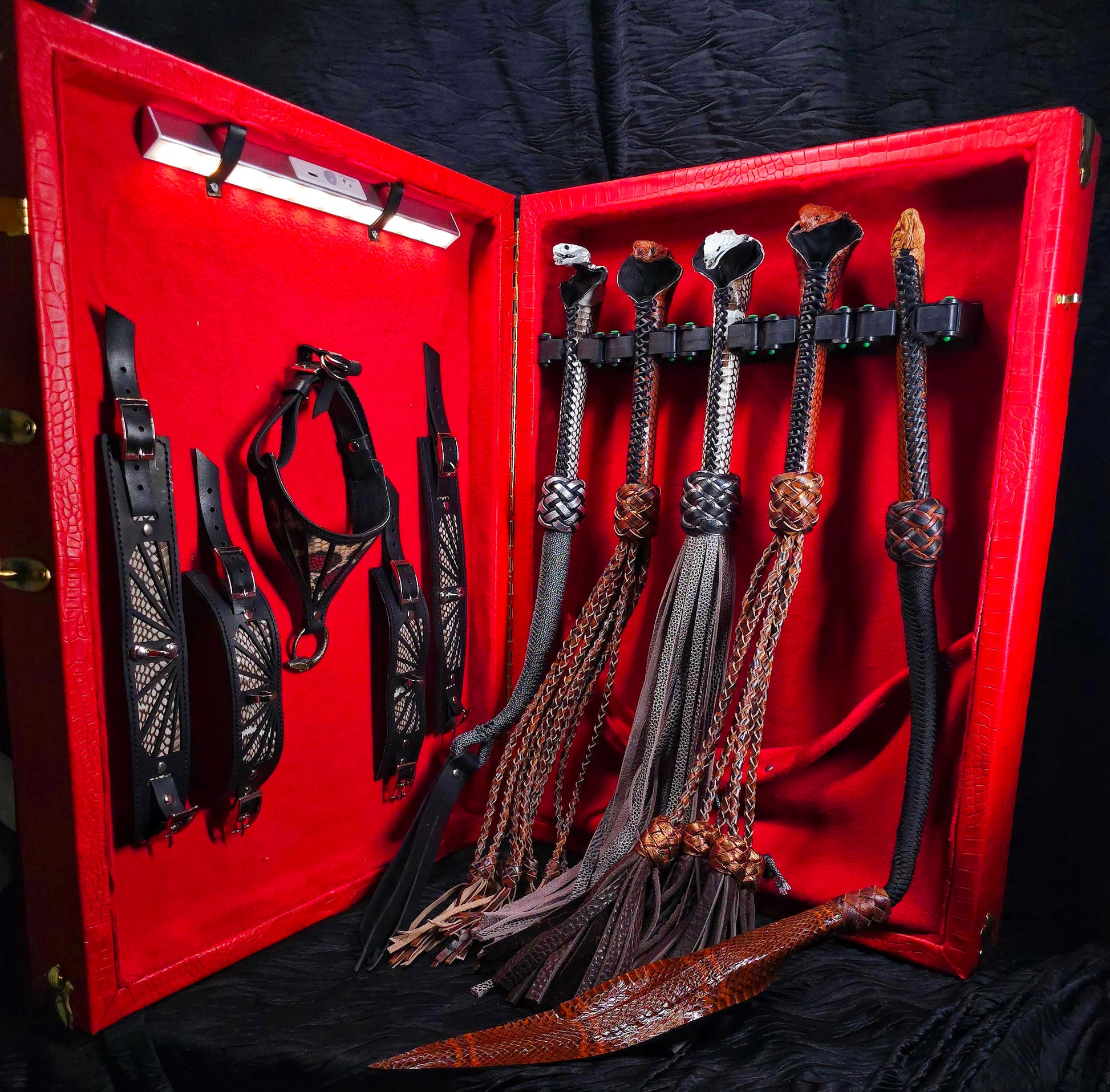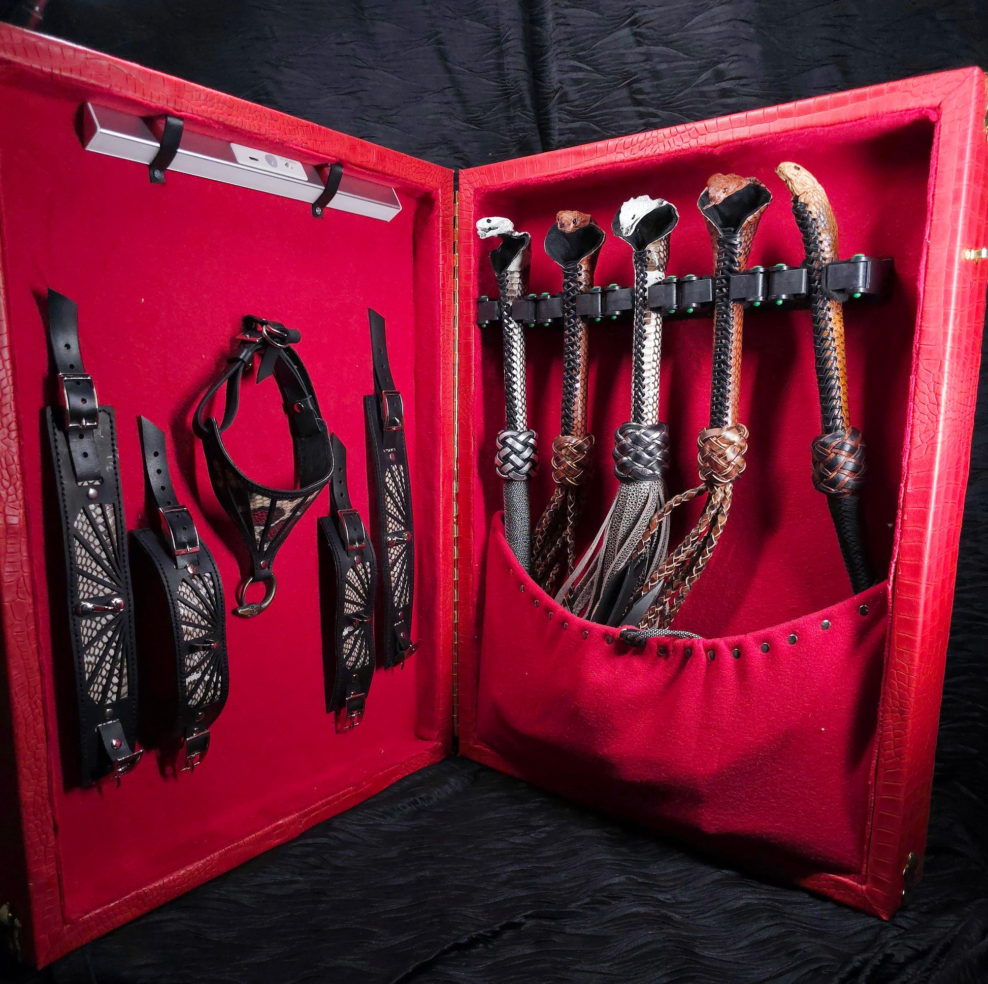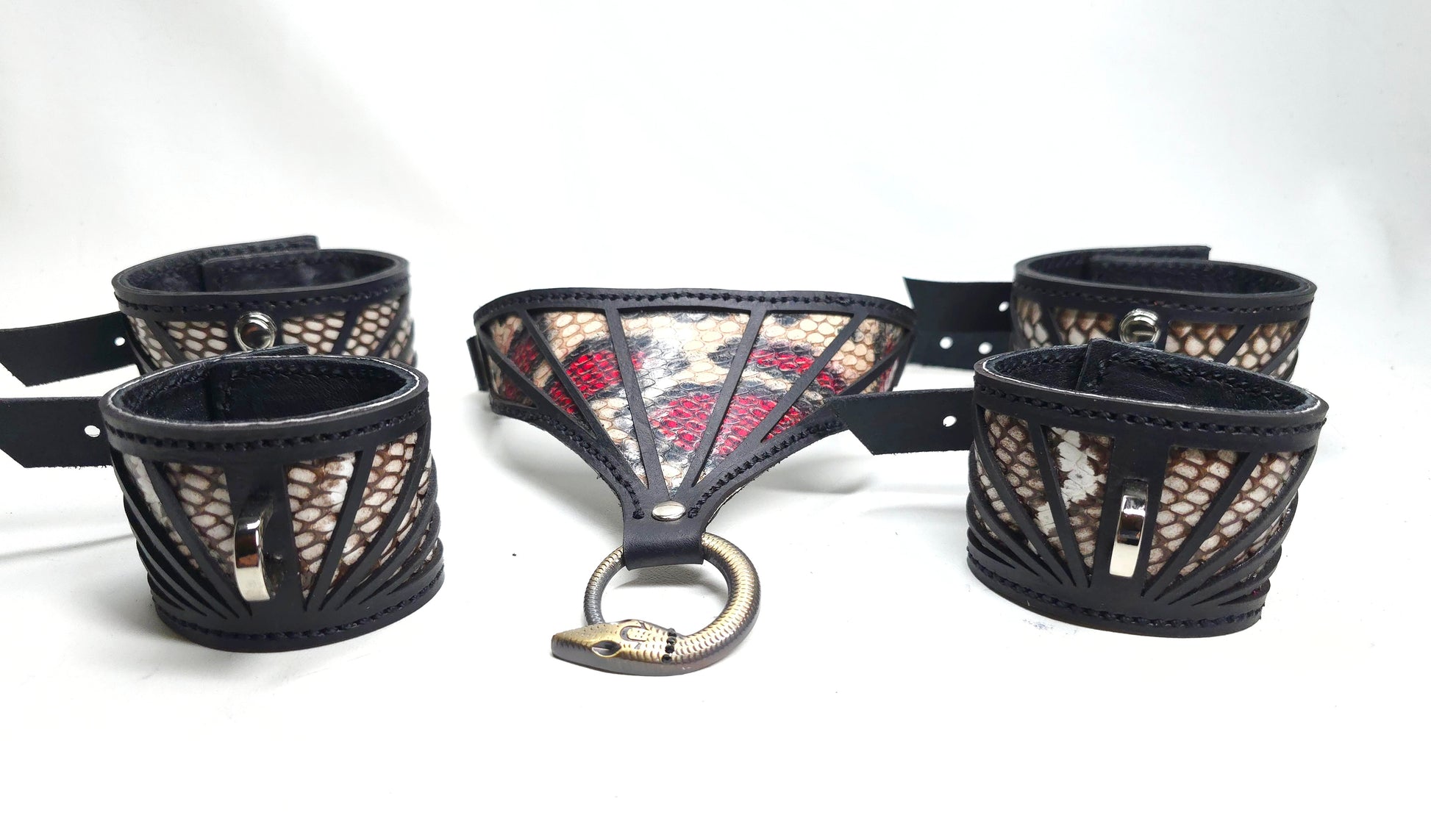 The case also contains a full set of leather restrains including a collar, a pair of ankle cuffs and a pair of wrist cuffs. They are accented with cobra skin.