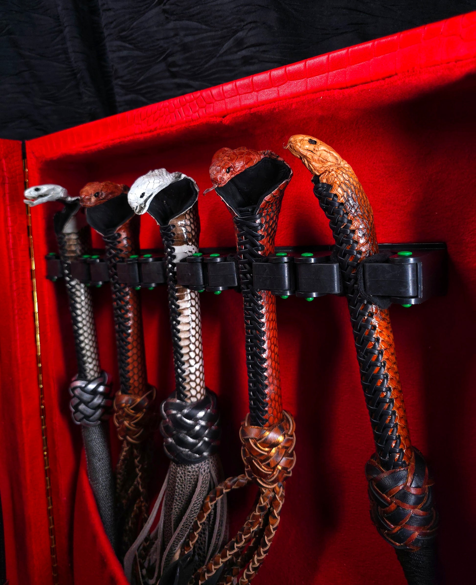 Each toy in the set is made with a cobra skin. The cobra head is preserved with the skull inside to maintain its shape. The rest of the cobra is used in the shaft of the handle over an oak core.
