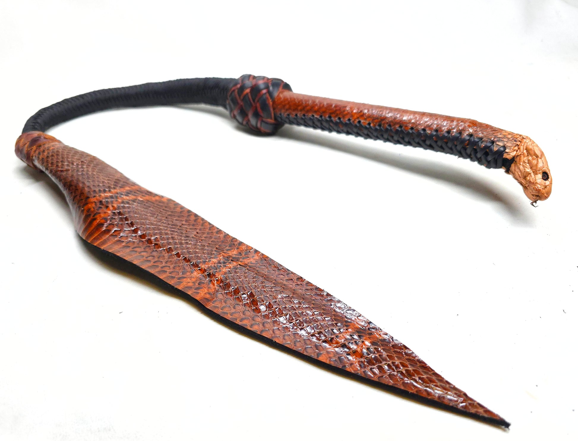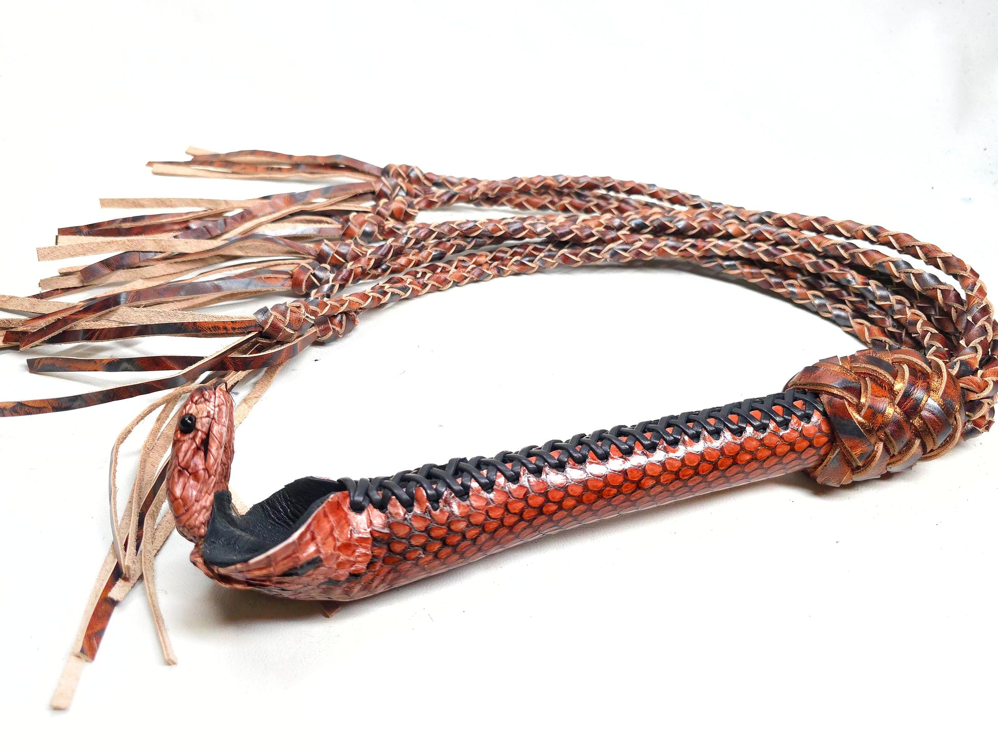 Scorpion- This is the one snake without a hood. This in intentional to make using the quirt easier. The twisting motion many people use for these toys is interrupted by the cobra hood. The snake is still a cobra, just with an amended hide. The stinger of the scorpion is reinforced with a latigo bone under black suede