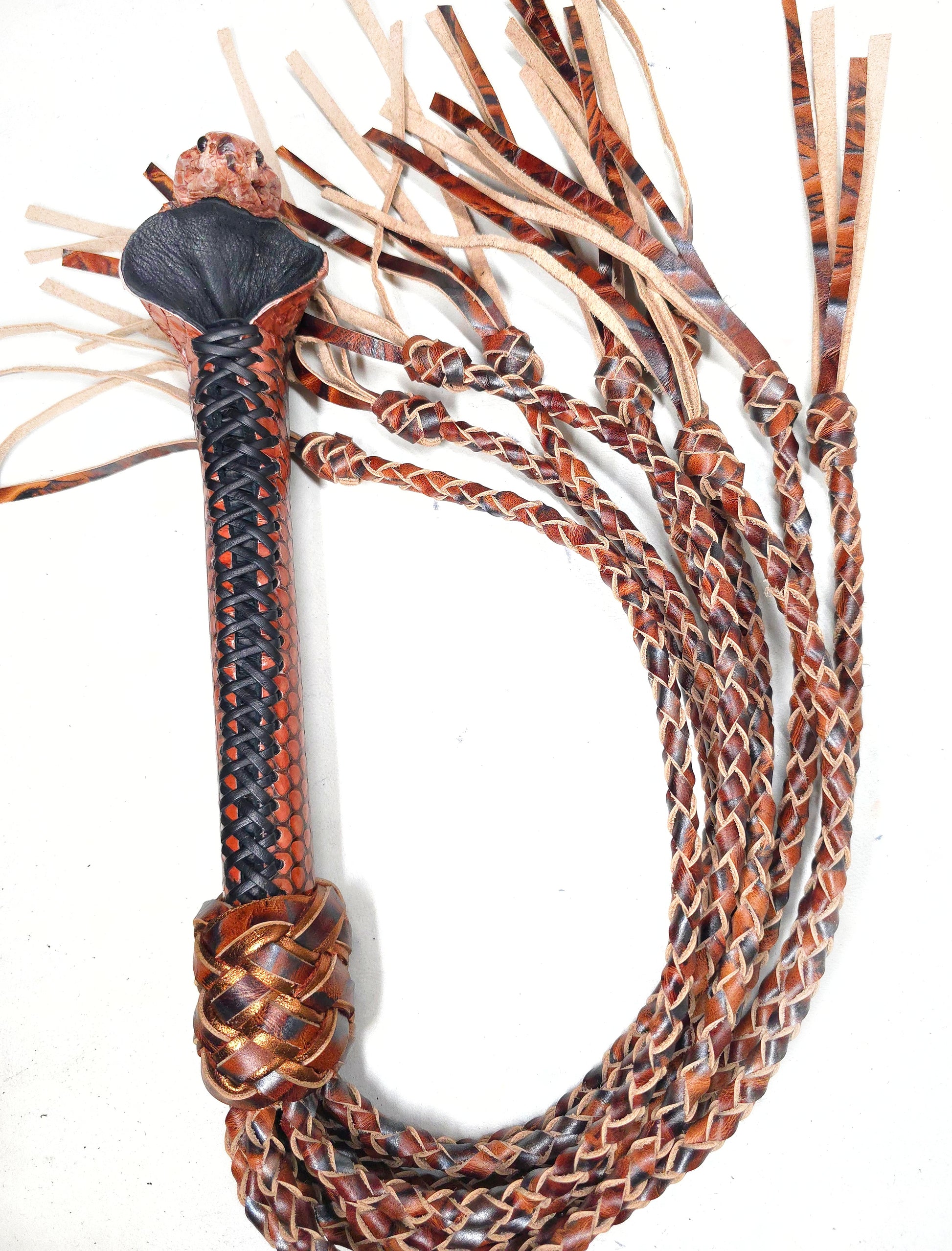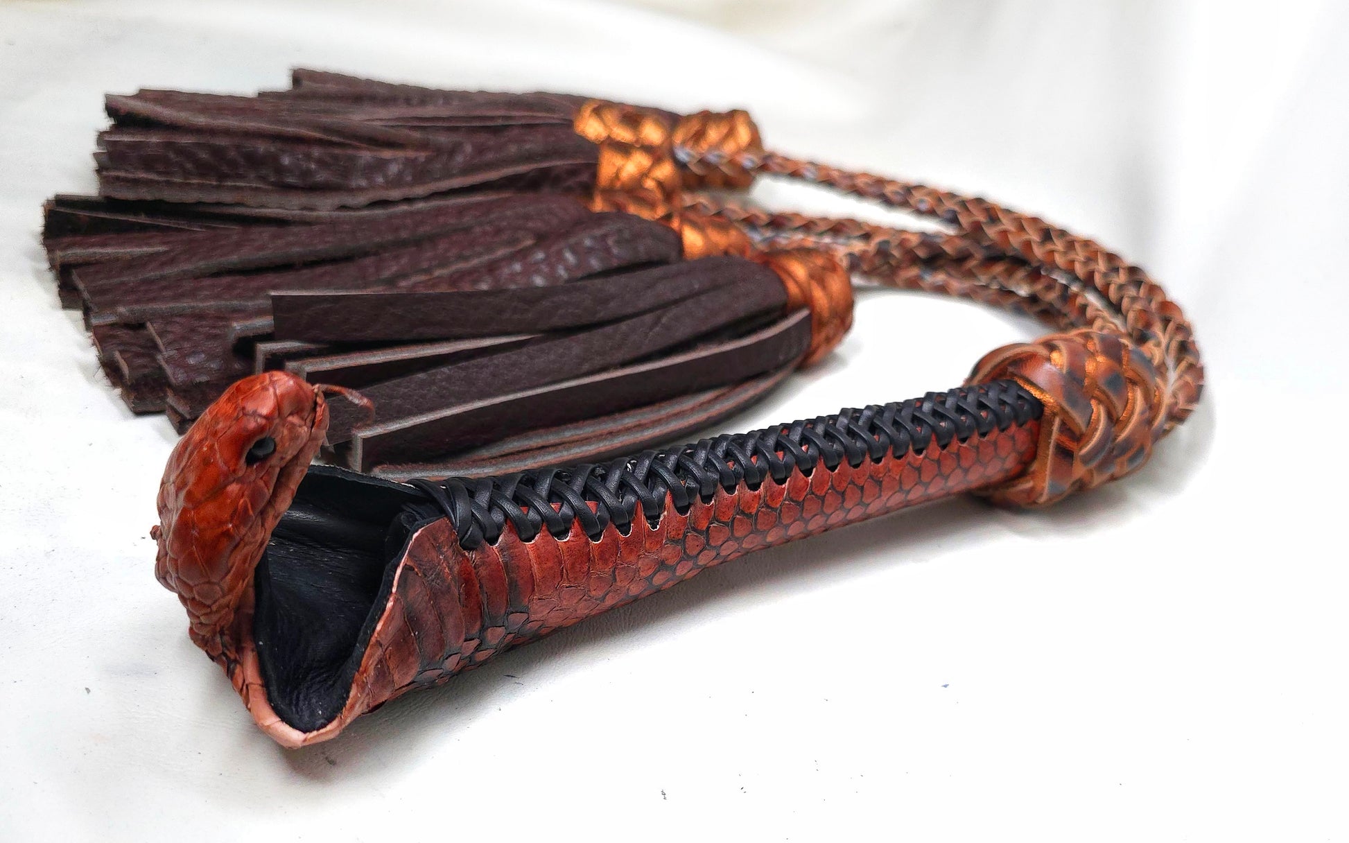 Cat O Nine Tails- I made this one in the traditional style with the blood knots for the braided ends. Depending on use this could be from medium to high intensity play. The leather used is brown with black and dark brown antiquing.