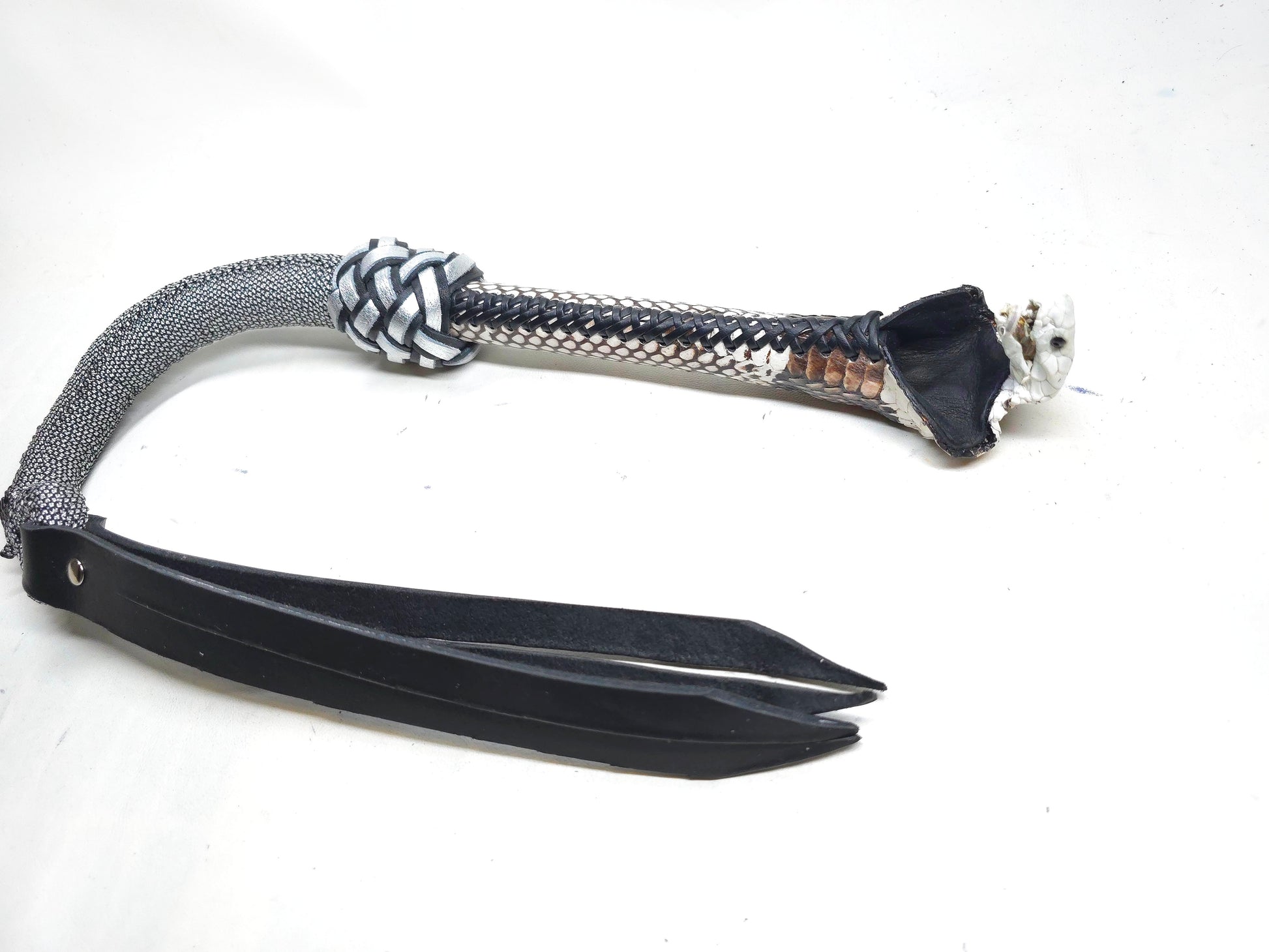 Quirt- The handle of the quirt is another white cobra with grey and black markings. The body of the tail is braided in black and silver checkered paracord. The tail is thick black latigo leather. Recommended for very heavy impact.