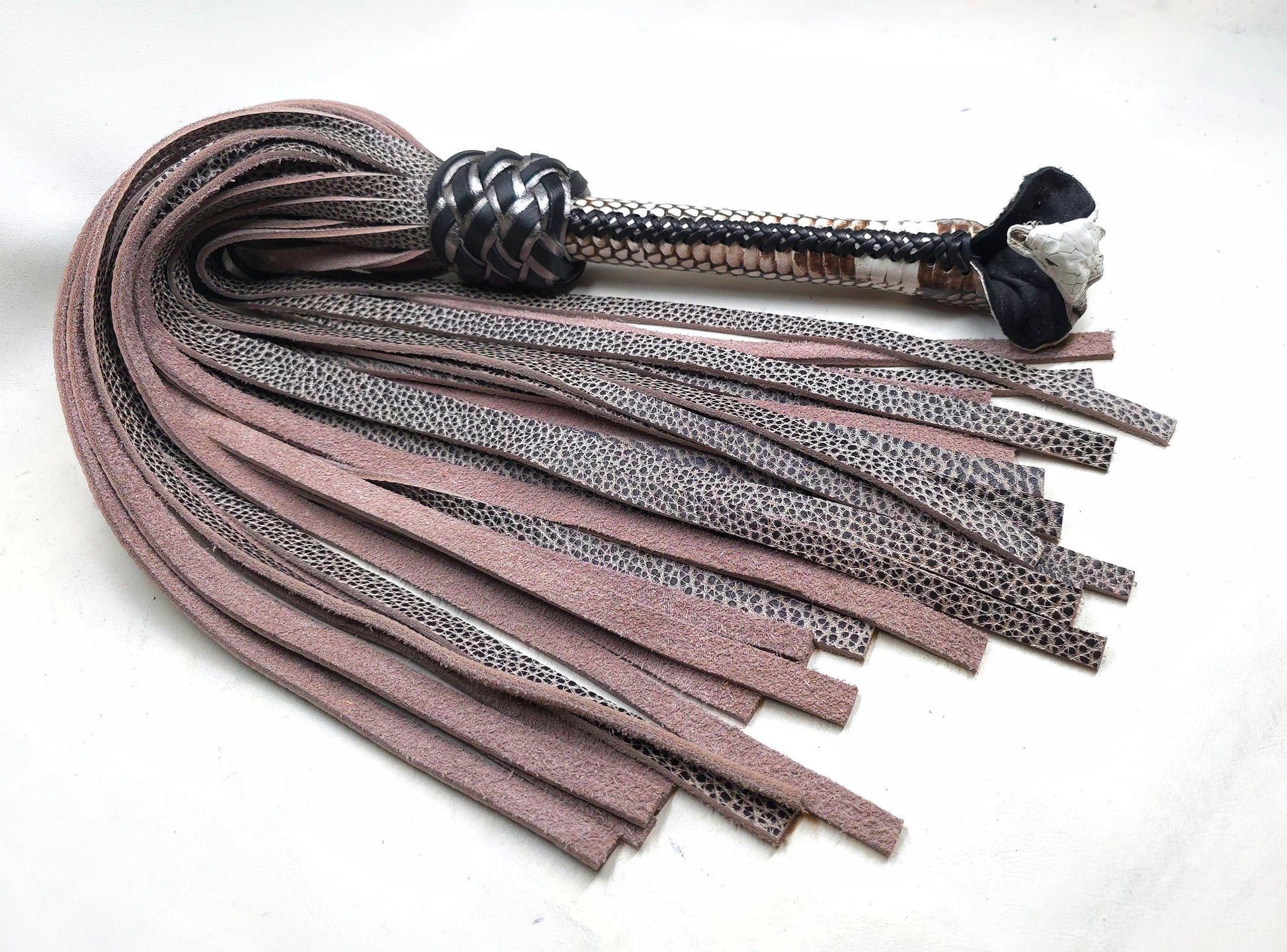 Waterbuffalo Flogger- Silver waterbuffalo with black tipping and a white, brown and grey cobra handle. Waterbuffalo is thick with a slightly stiff temper. I recommend it for medium to heavy impact play