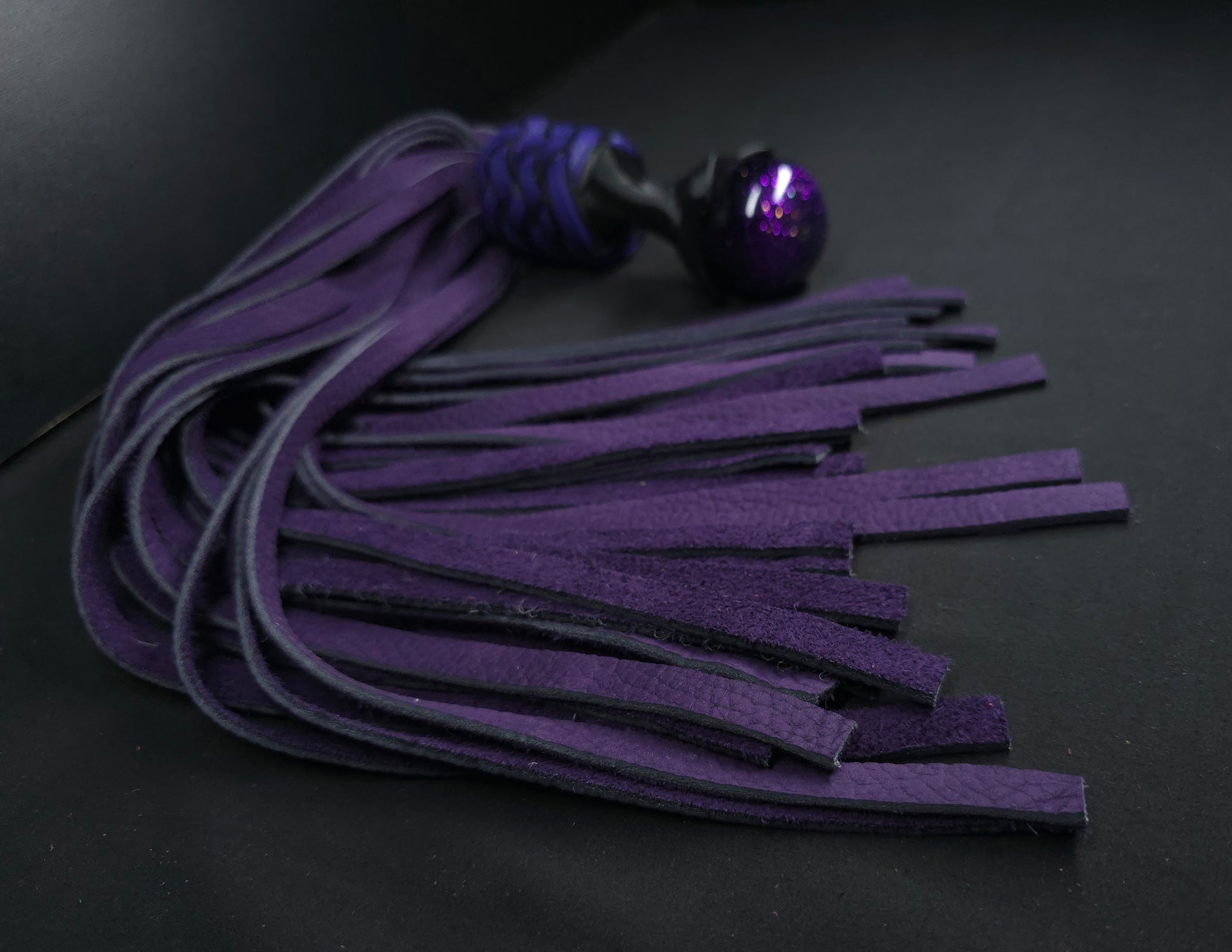 This gorgeous flogger is made from soft, pettable velvet leather. This is a bullhide that has been softened and given a luxurious nap. It is our superior replacement for elk. The handle has a 55mm ball with a mix of purple glitter. The glitter is encased inside the resin handle and cannot come out. The tails are 18 inches long.
