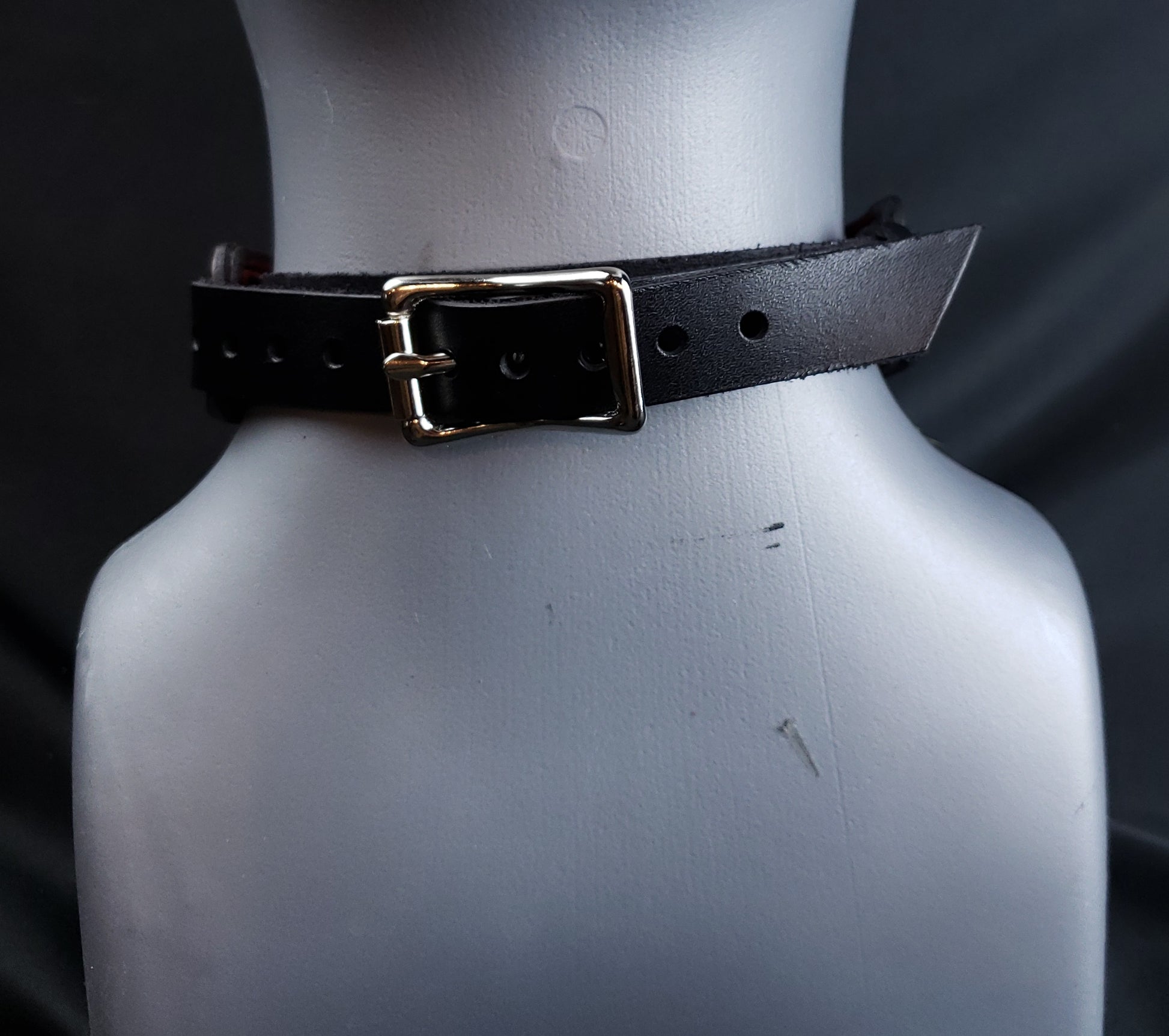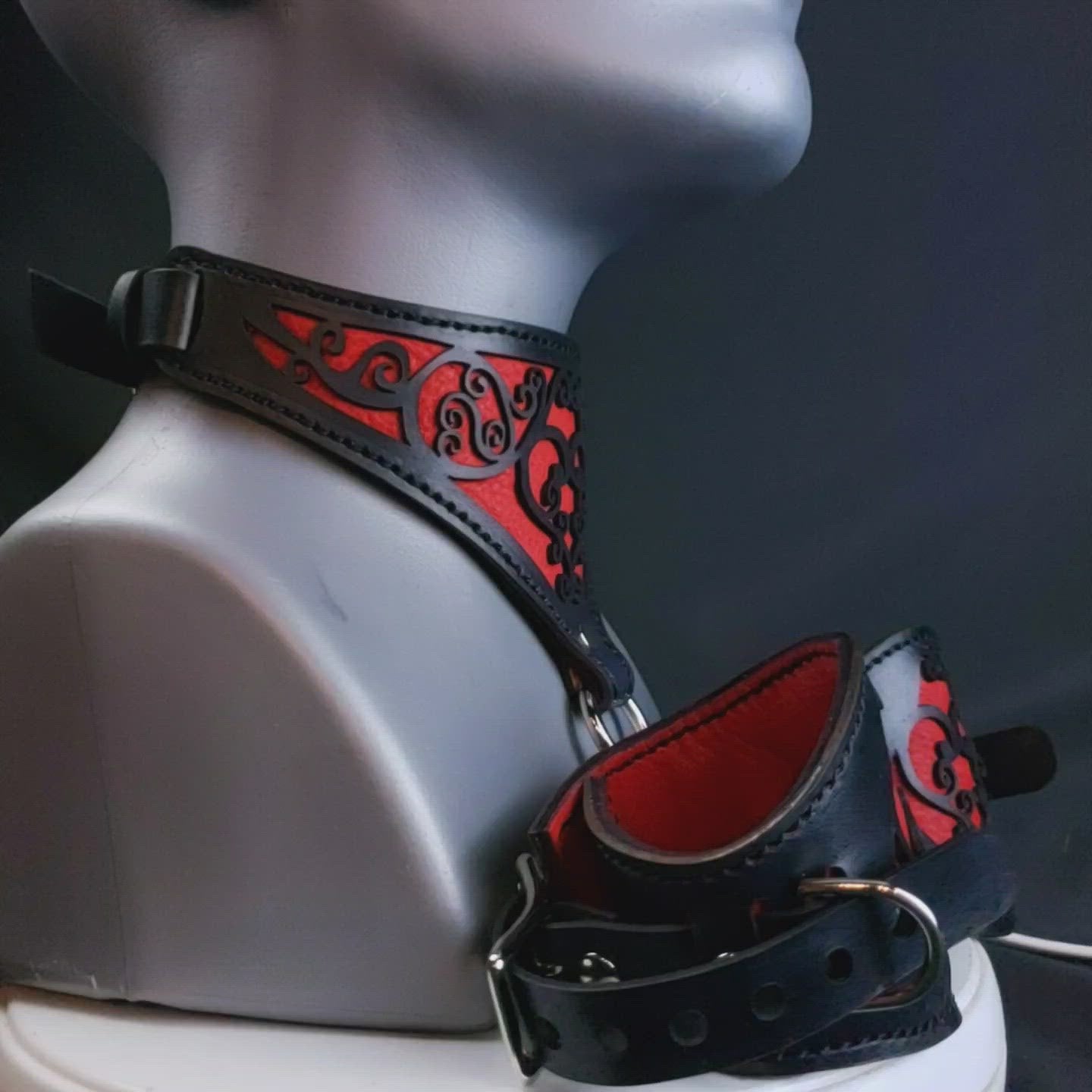 These restraints are made with three panels of leather. The black front piece is laser cut with the filigree design. There are two layers behind that, one for color in the design and the last to be soft against the skin. The collars are stitched along the edges with 1mm nylon bonded thread. All of the hardware is steel. The ring is a welded o ring. They are not nickel free! The design keeps the metal off the skin with the exception of the center ring on the collar.