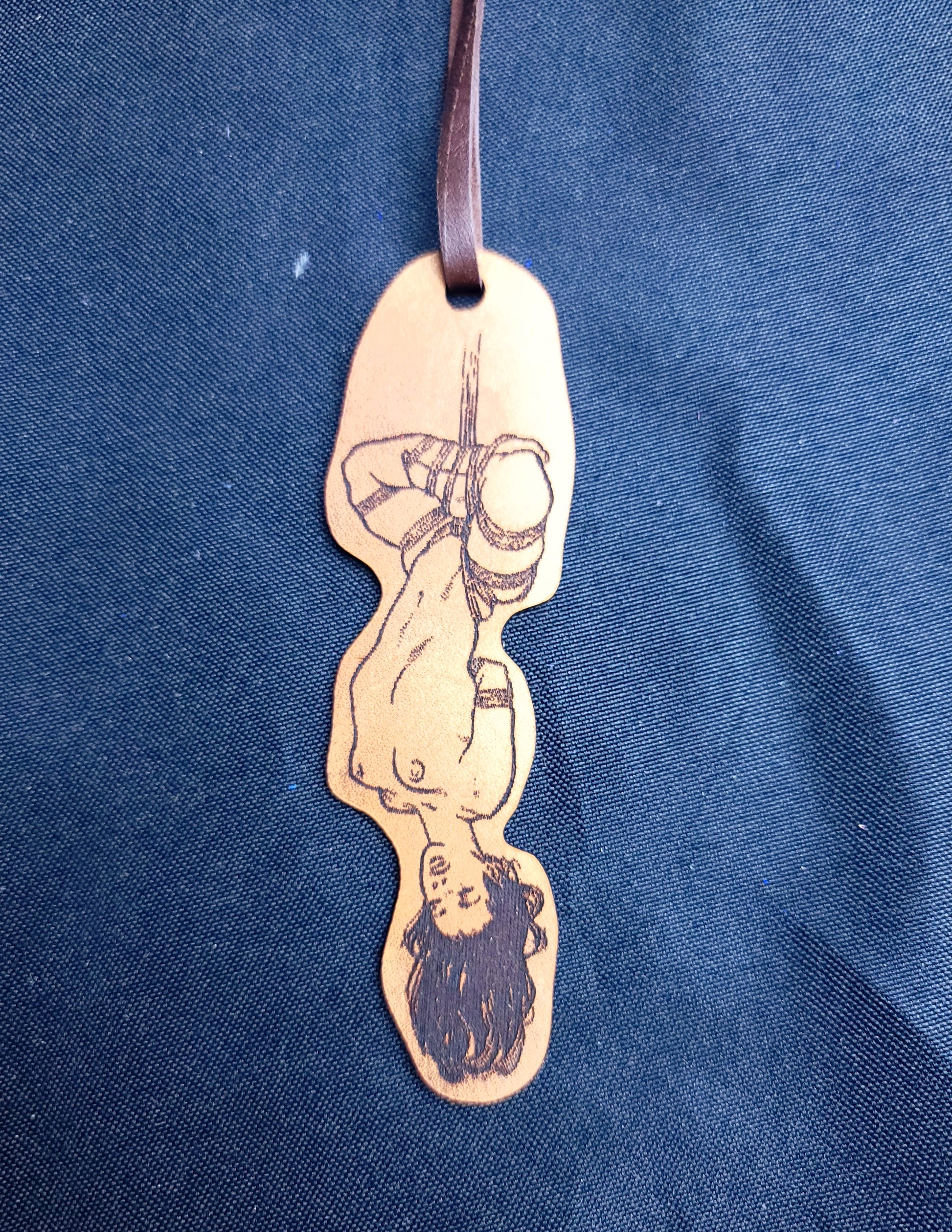 Add a little spice to your reading experience with a leather bookmark engraved with a lovely human in bondage. The top of the bookmark has a soft leather thong with a bead so the bookmark can't slide down under the pages when the book is closed.