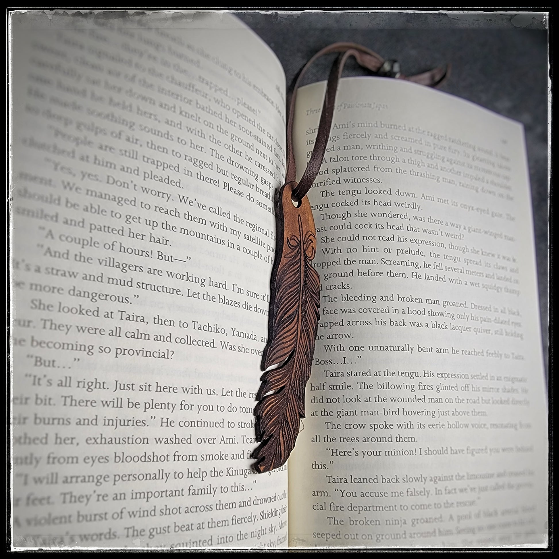 Simple feather engraved in leather. The top of the bookmark has a soft leather thong with a bead so the bookmark can't slide down under the pages when the book is closed.