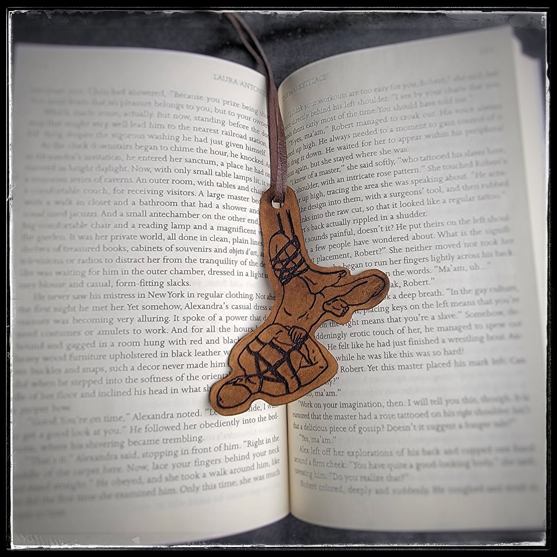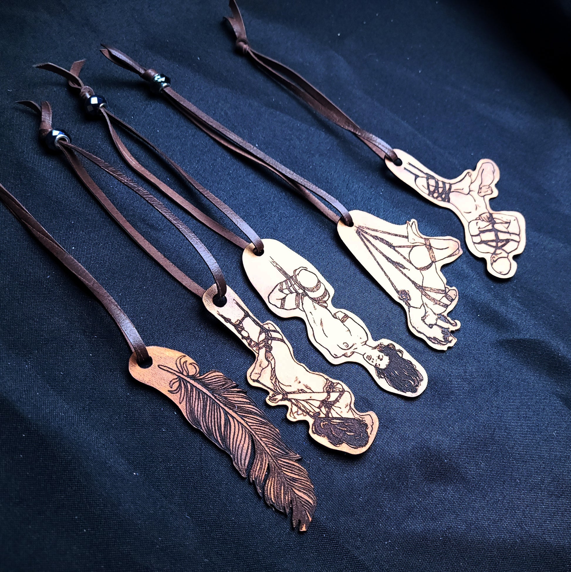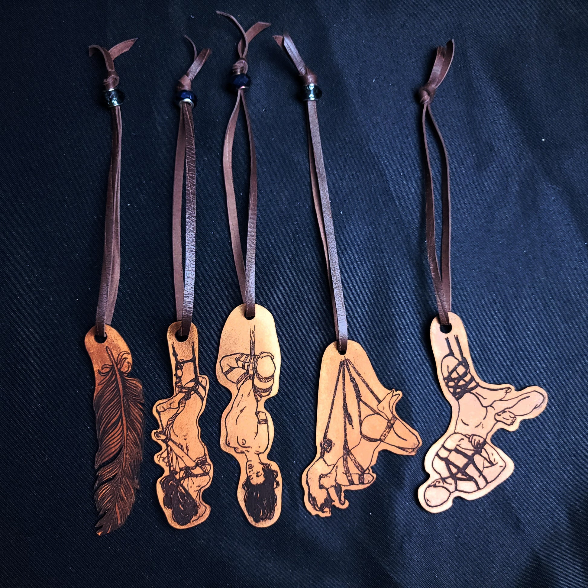 For the serious bookworms who need to mark their most spicy pages. This is the full set of all five leather bookmarks. The top of the bookmarks have a soft leather thong with a bead so the bookmark can't slide down under the pages when the book is closed.