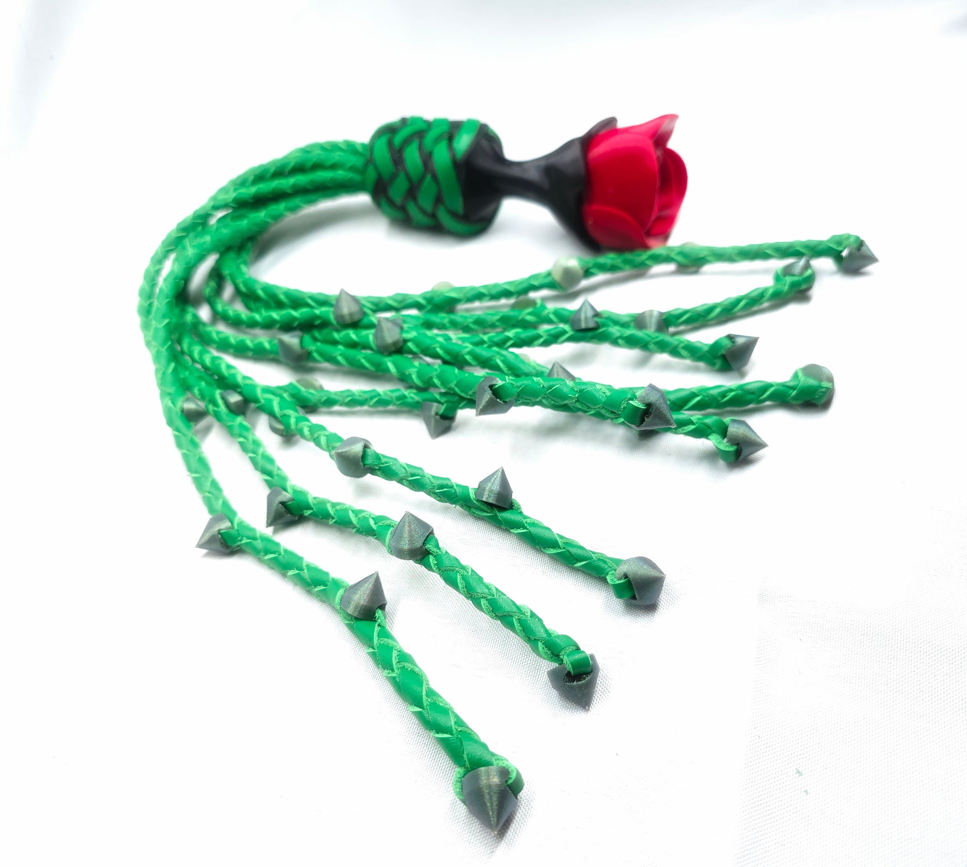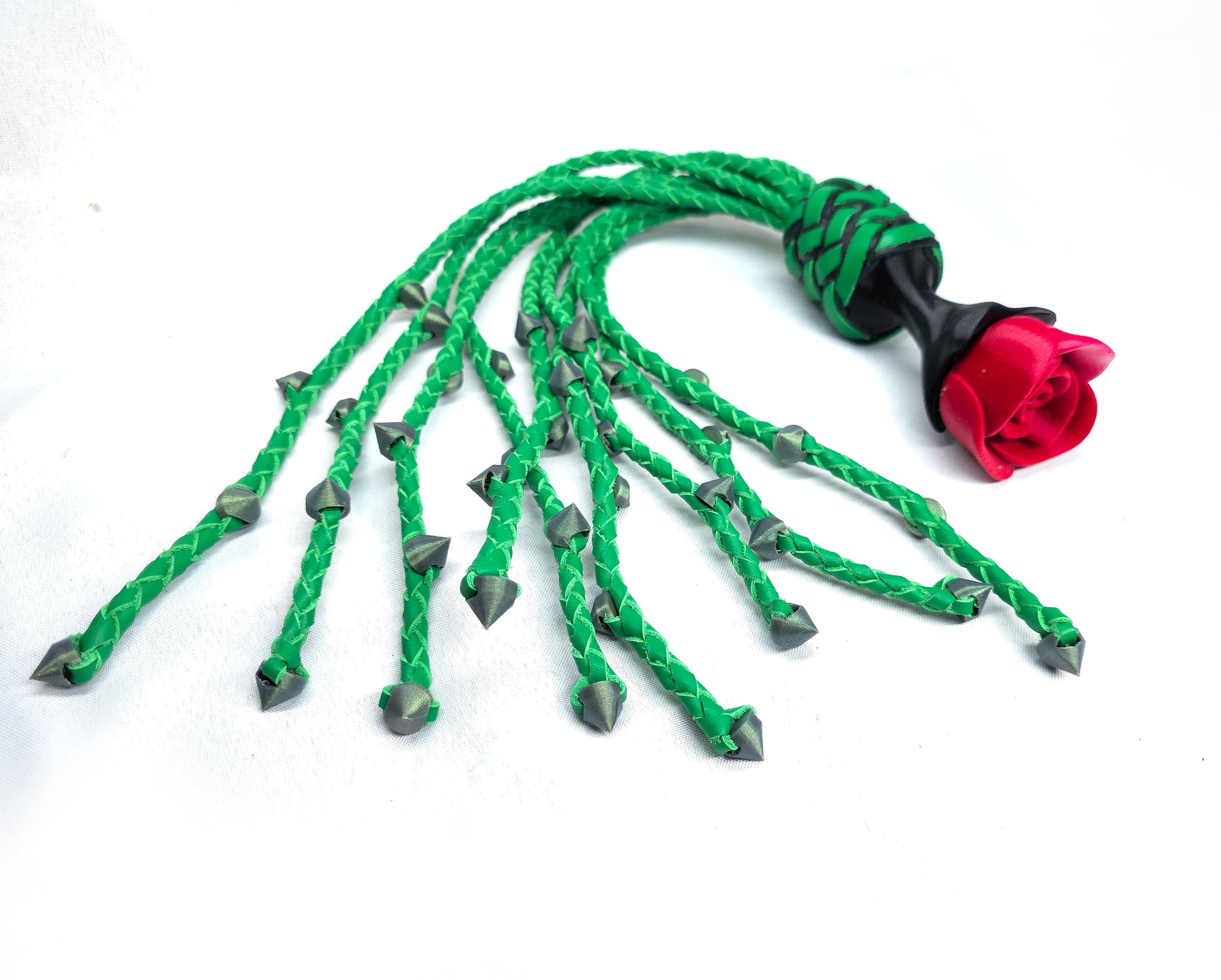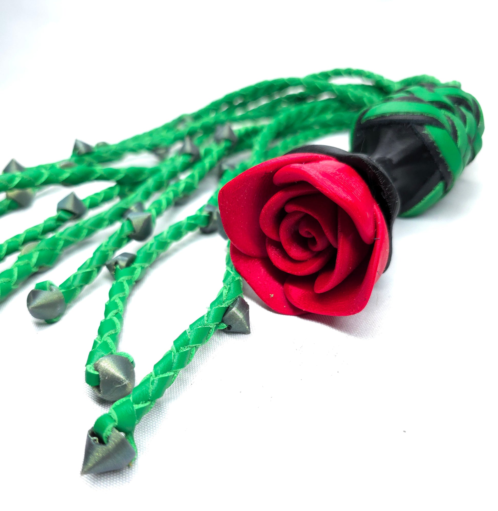 Rose Thorn Cat O Nine Flogger with Rose Handles and Thorns braided into the leather tails.